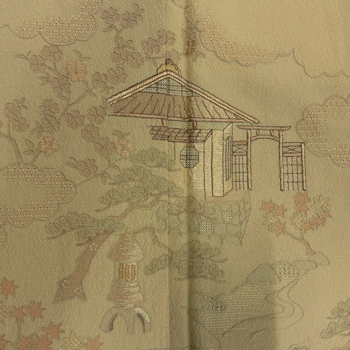 【美品】 小紋 身丈165.5cm 裄丈65cm M 袷 袋帯セット 楓 建物 縮緬 灰茶 正絹 名品