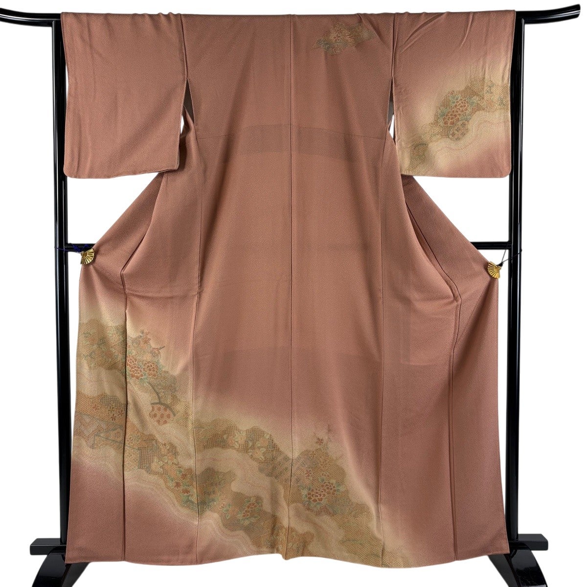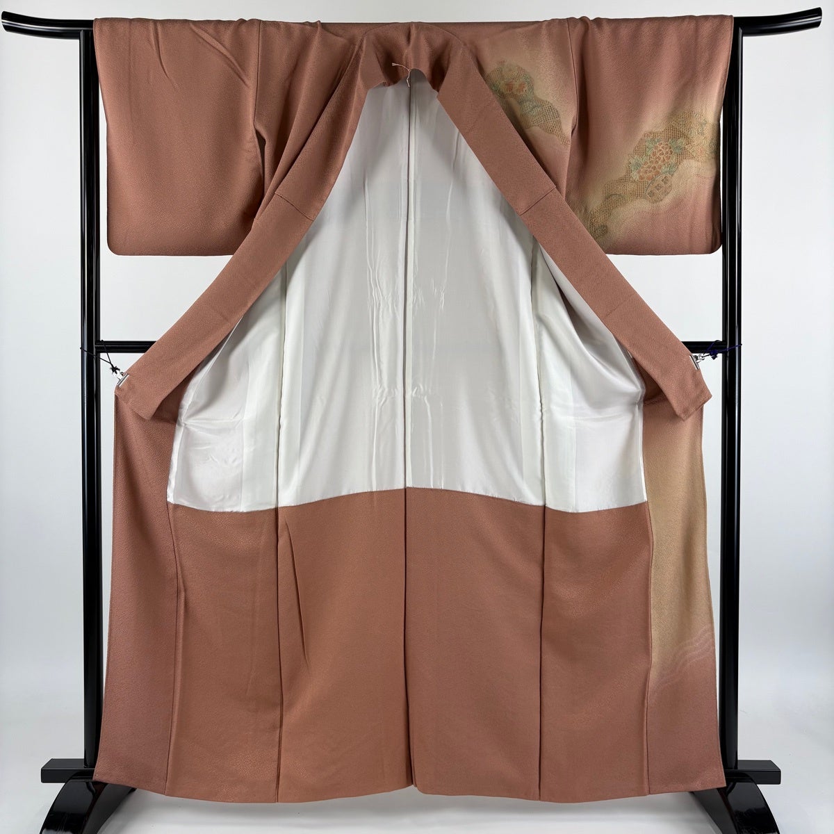 【美品】 訪問着 身丈164cm 裄丈65cm M 袷 花柄 観世水 金彩 染め分け 薄茶色 正絹 秀品