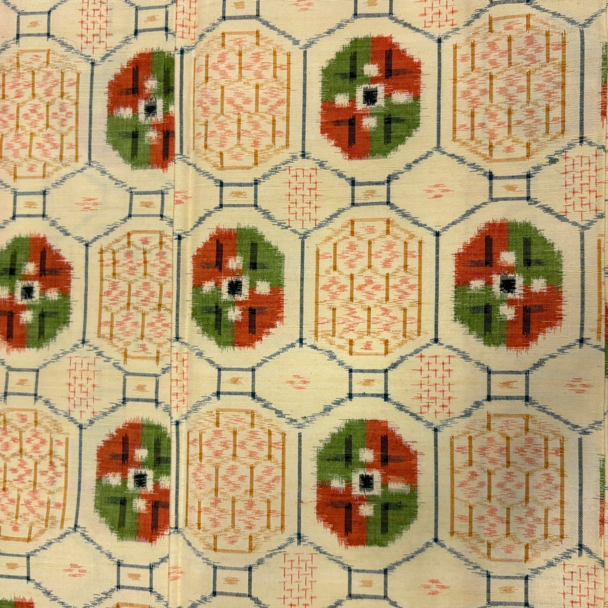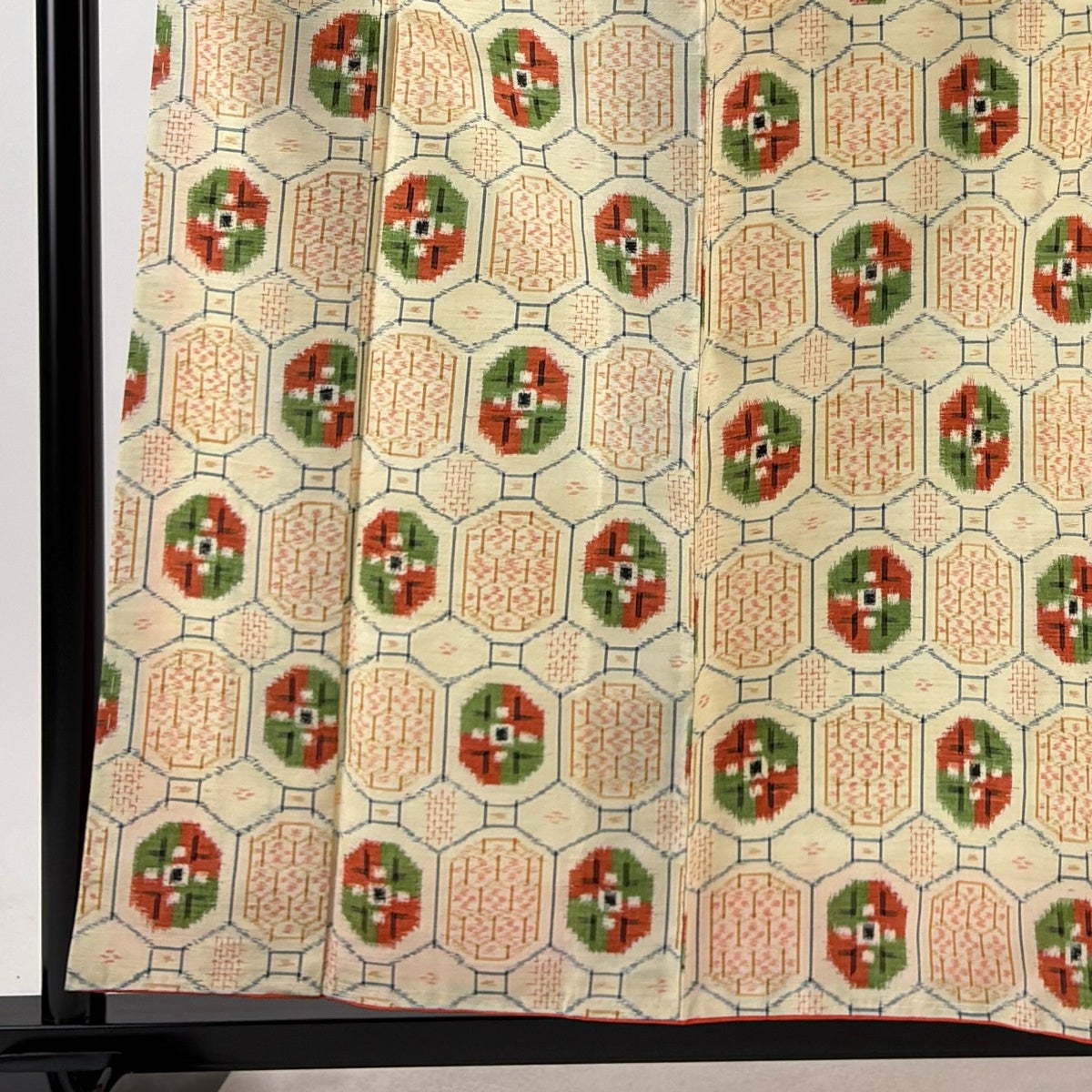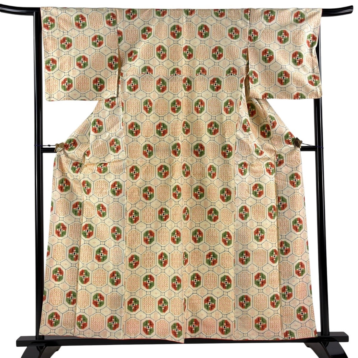 【美品】 小紋 身丈160cm 裄丈65cm M 袷 二代目 更甚 落款あり 更紗 有職文様 縮緬 山吹茶色 正絹 秀品