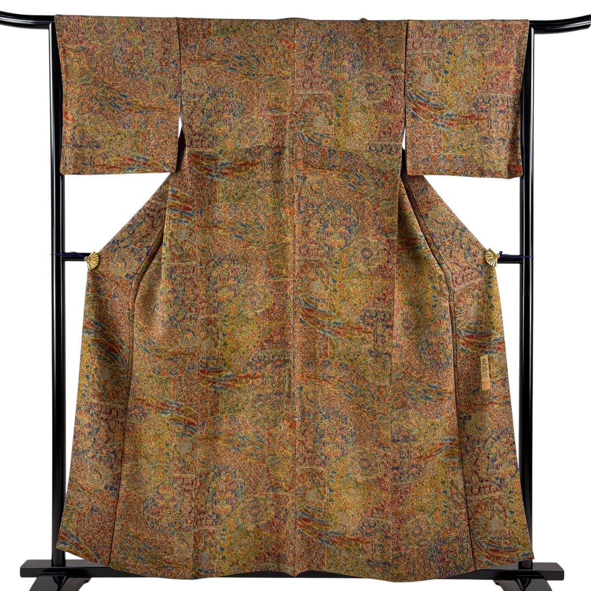 【美品】 小紋 身丈157cm 裄丈65.5cm M 袷 ?多野良造 落款あり 市松 柿渋染 焦茶色 正絹 秀品