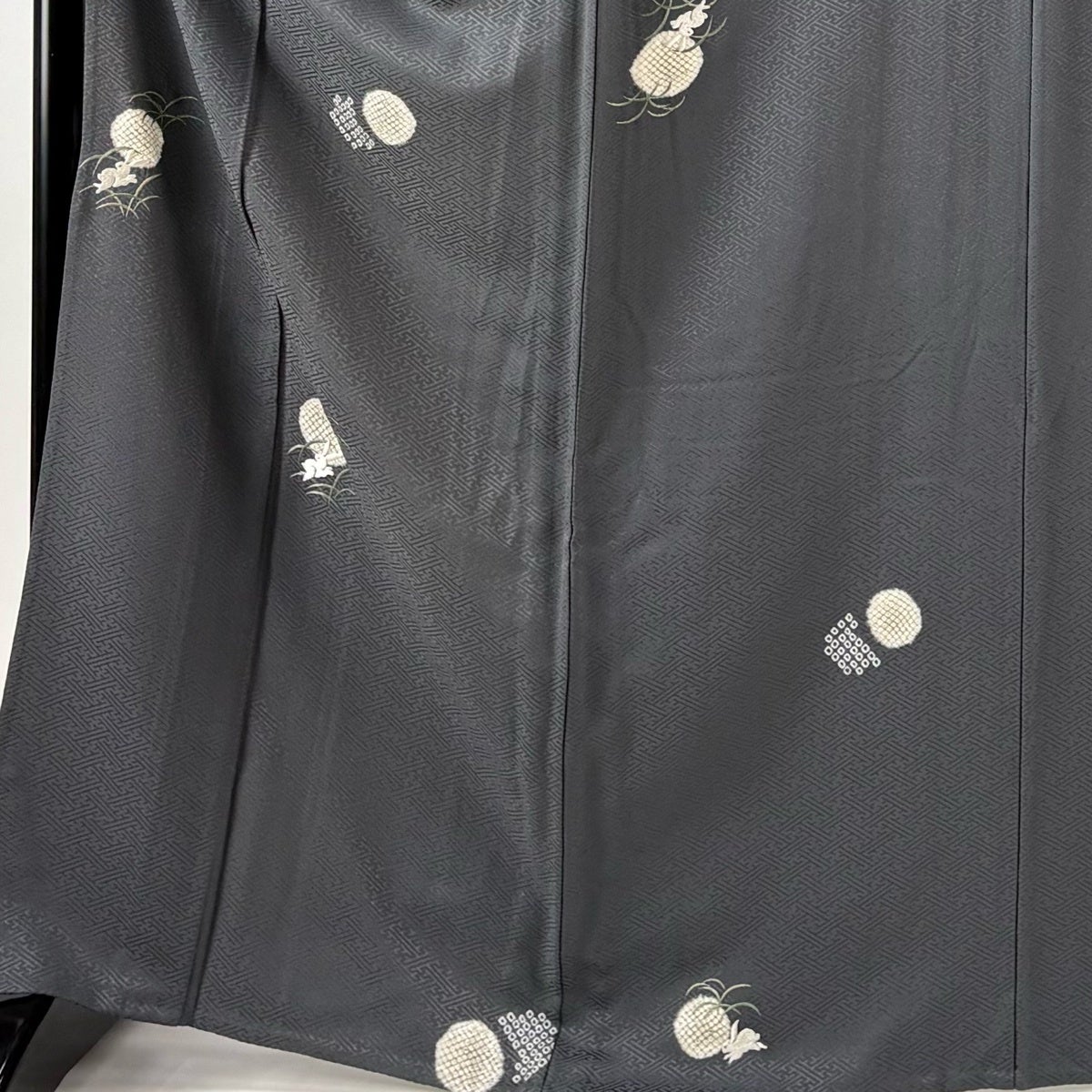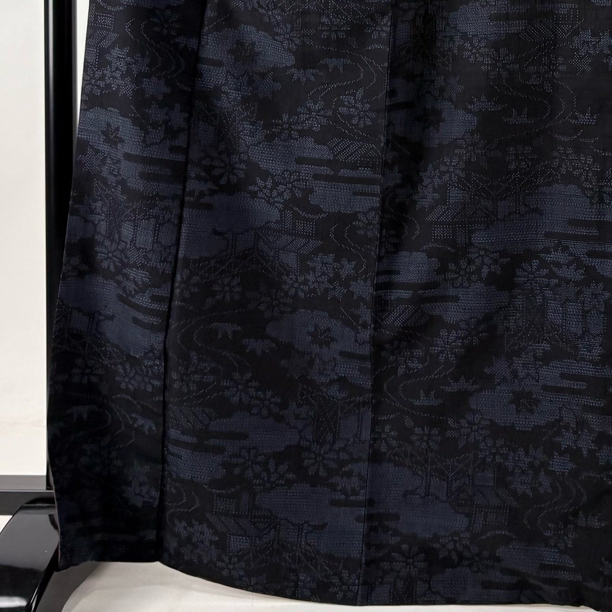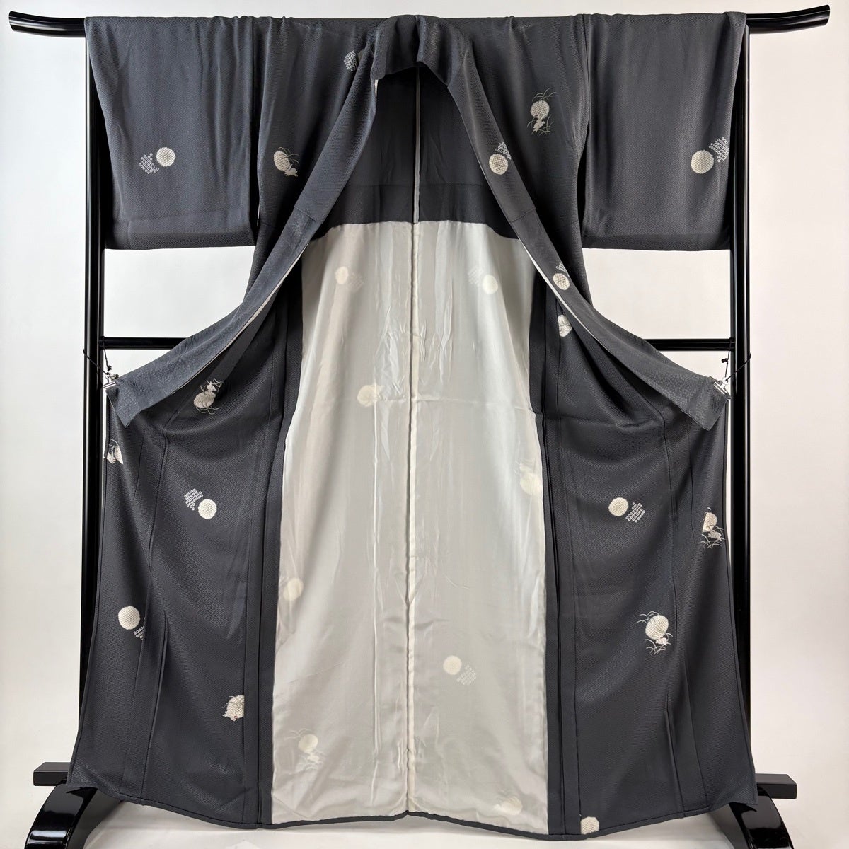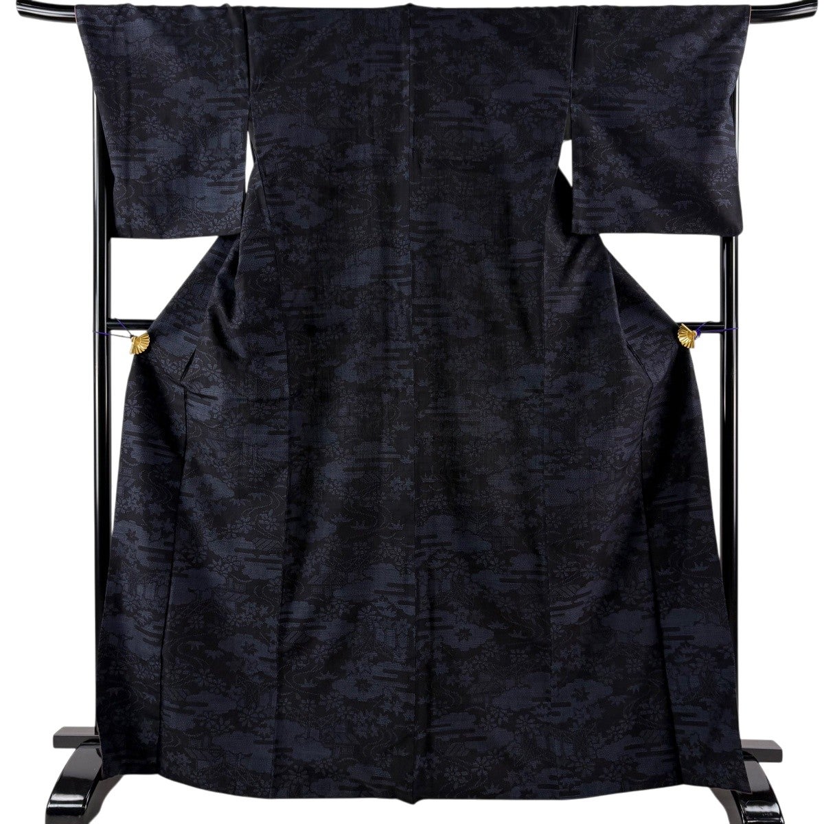 50%OFF 紬 身丈167.5cm 裄丈69cm L 袷 雲文 草花 黒 正絹 名品 K50