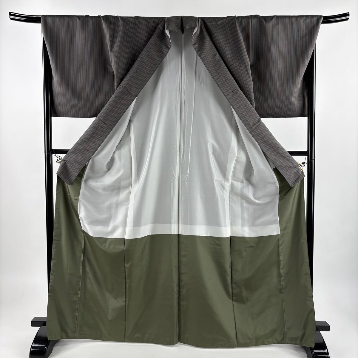50%OFF 紬 身丈164cm 裄丈69cm L 袷 幾何学 縞 茶緑色 正絹 名品 K50