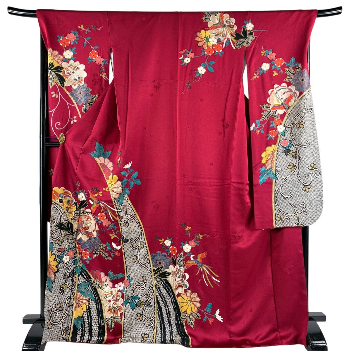 30%OFF 振袖 身丈169.5cm 裄丈69cm L 袷 花唐草 鳥 金糸 金彩 茜色 正絹 秀品 K30
