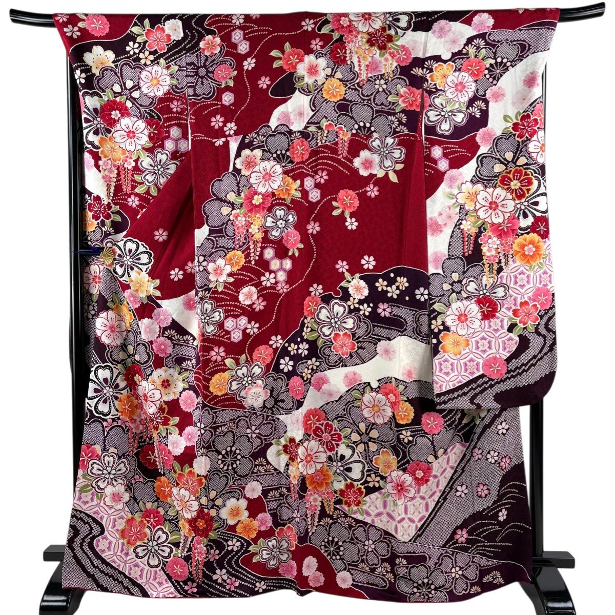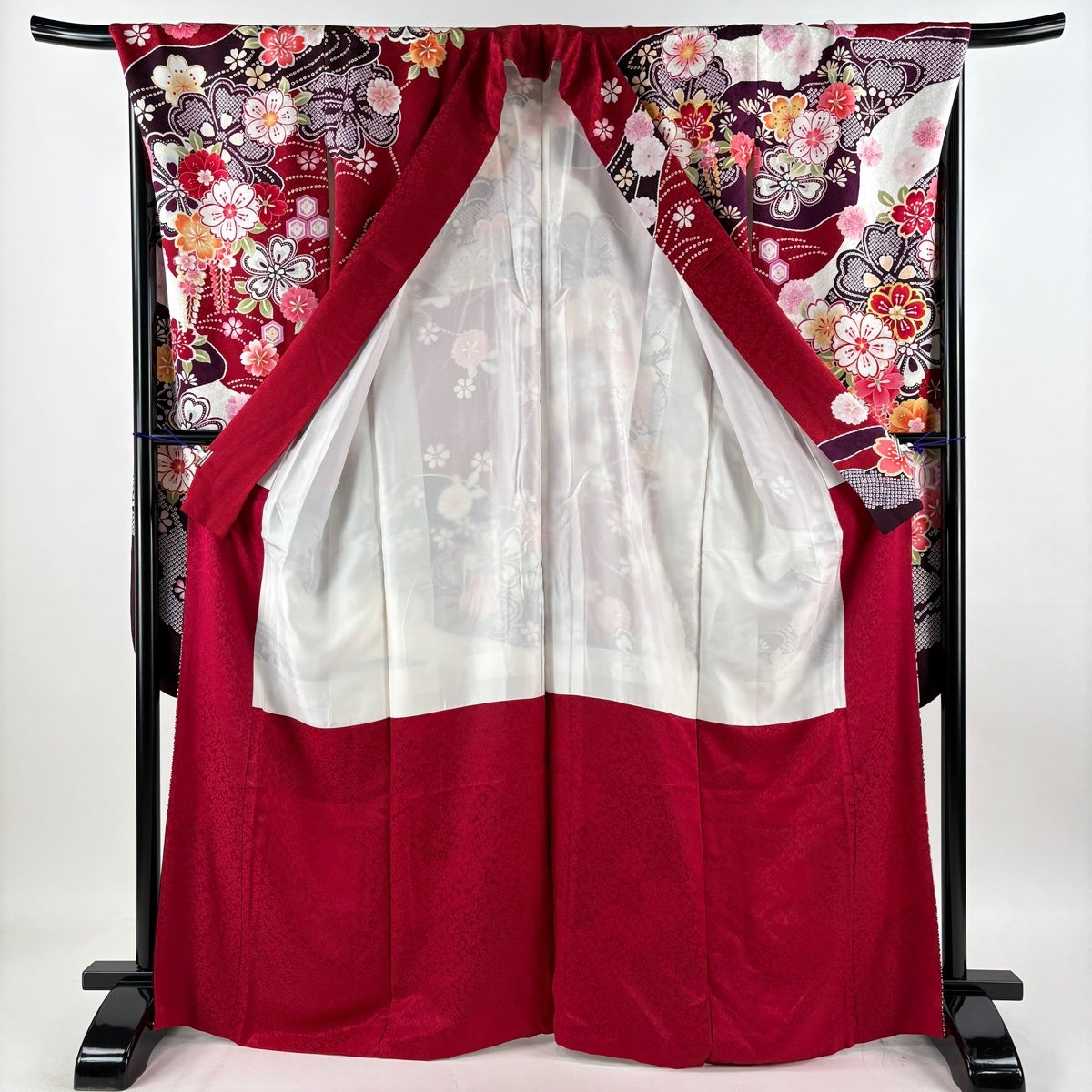 30%OFF 【美品】 振袖 身丈168cm 裄丈69cm L 袷 桜 藤 金彩 染め分け えんじ色 正絹 名品 K30