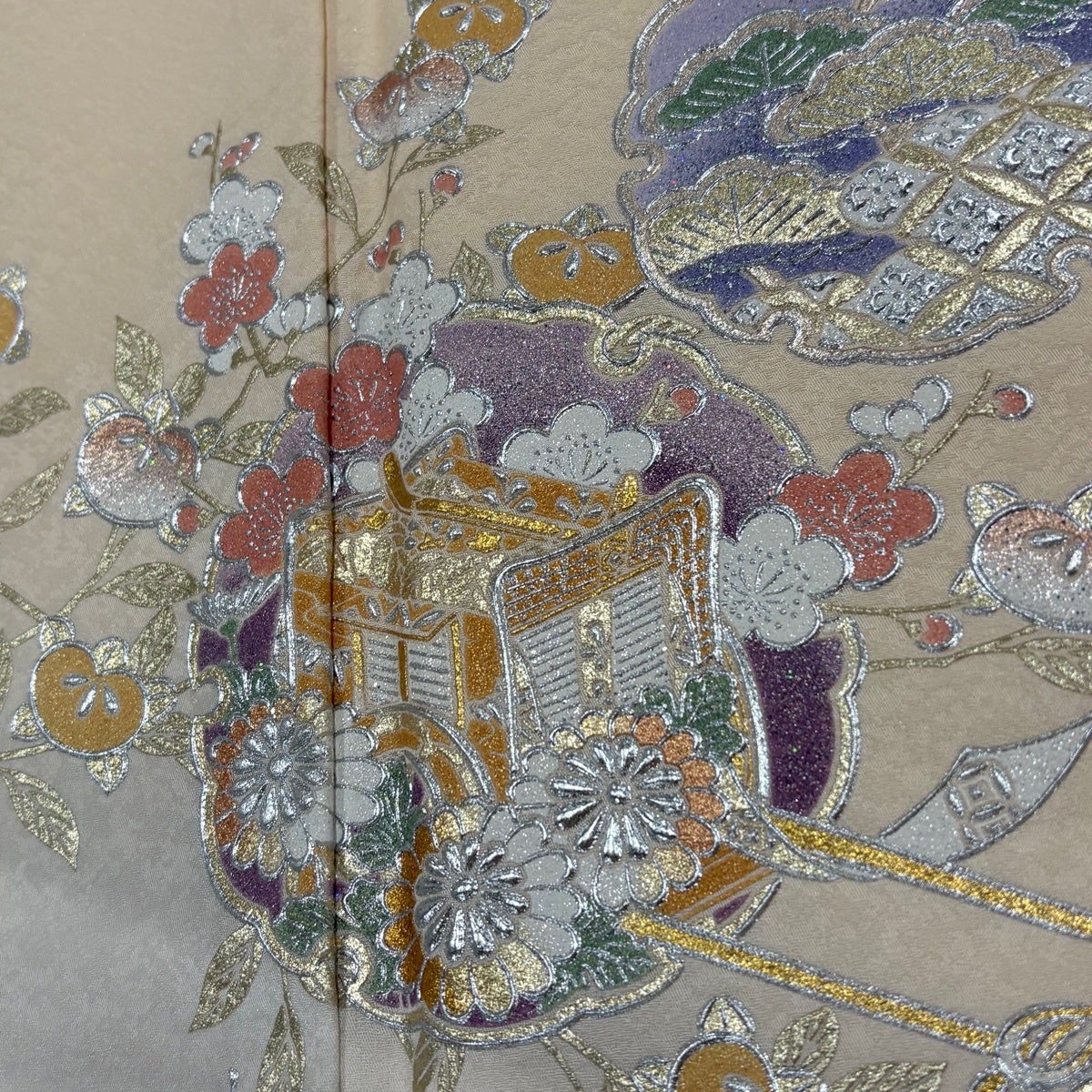 付下げ 身丈169cm 裄丈70.5cm L 袷 和田光正 落款あり 松竹梅 御所車 金銀彩 ラメ 薄オレンジ 正絹 逸品