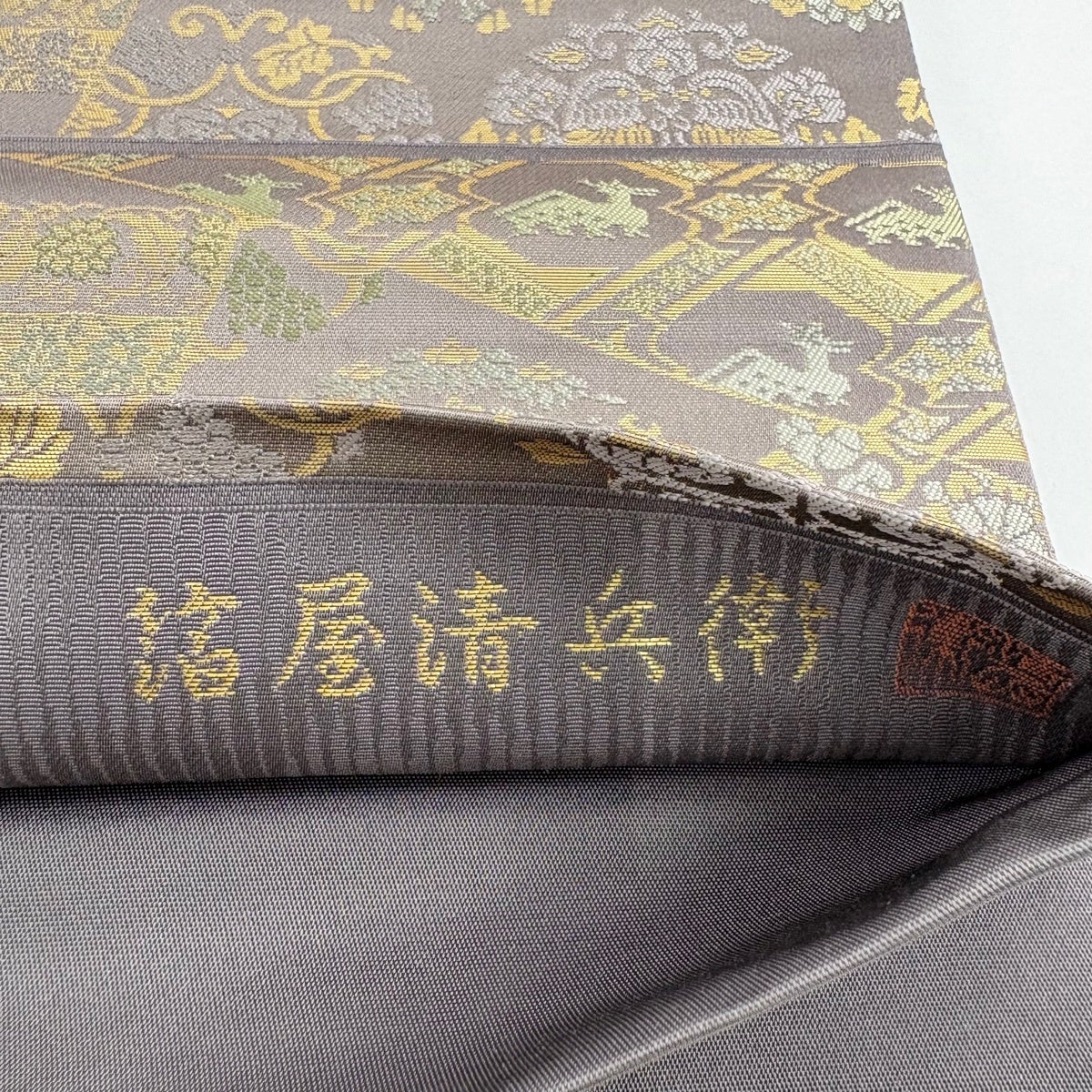 袋帯 逸品 桝屋高尾 落款あり ねん金綴錦 関西仕立て 段霞文 金糸 箔 薄茶色 全通 正絹