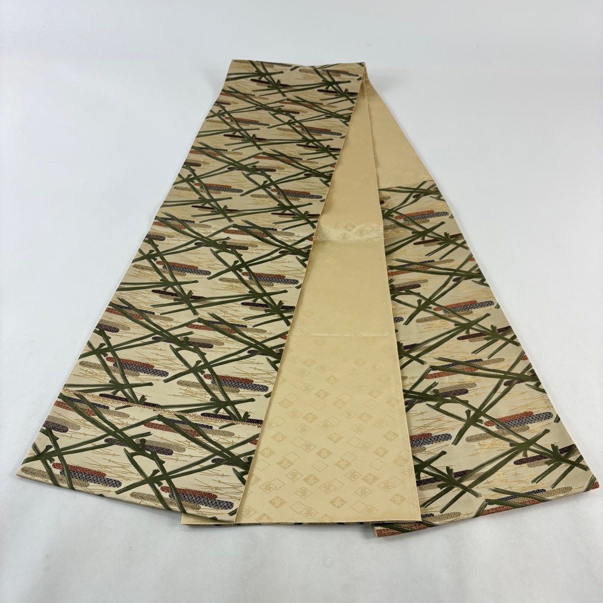 【美品】 袋帯 秀品 織悦 落款あり 夏帯 関西仕立て 梅 葉柄 金糸 葉柄 茶色 全通 正絹