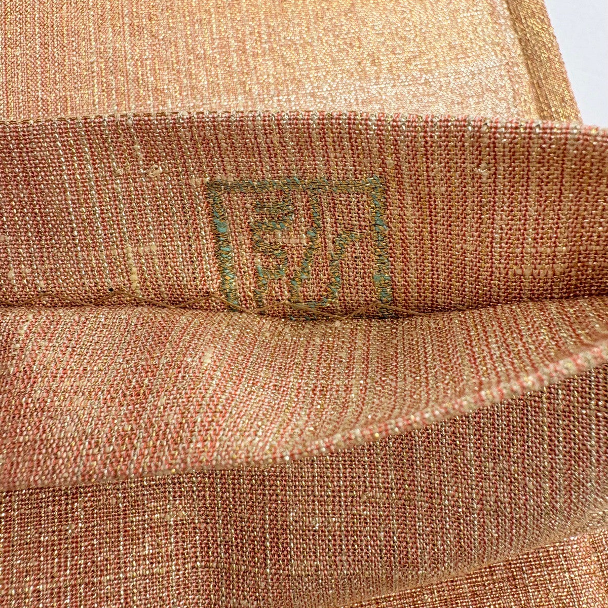 袋帯 名品 桝屋高尾 落款あり ねん金綴錦 関西仕立て 段霞文 金通し 薄オレンジ 全通 正絹