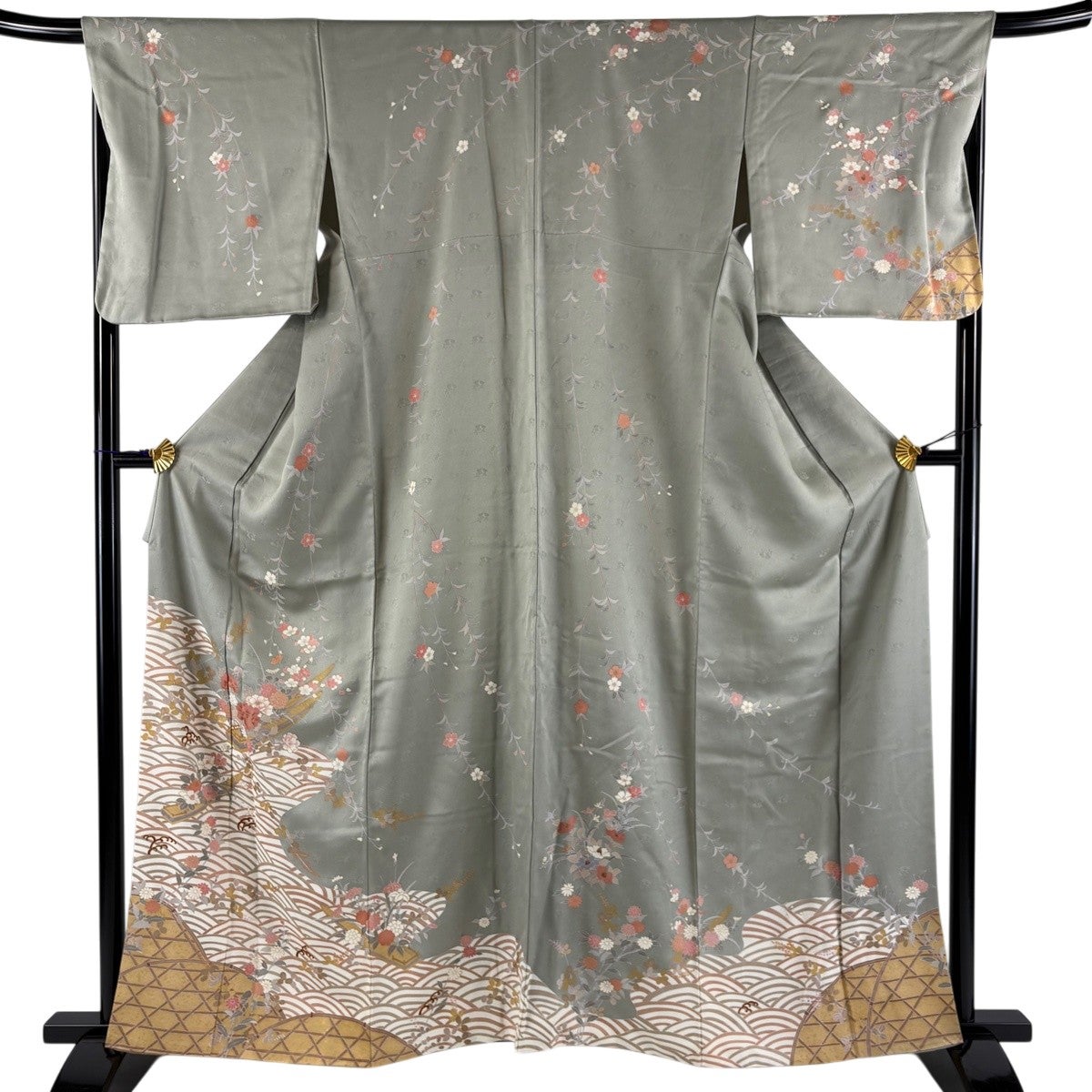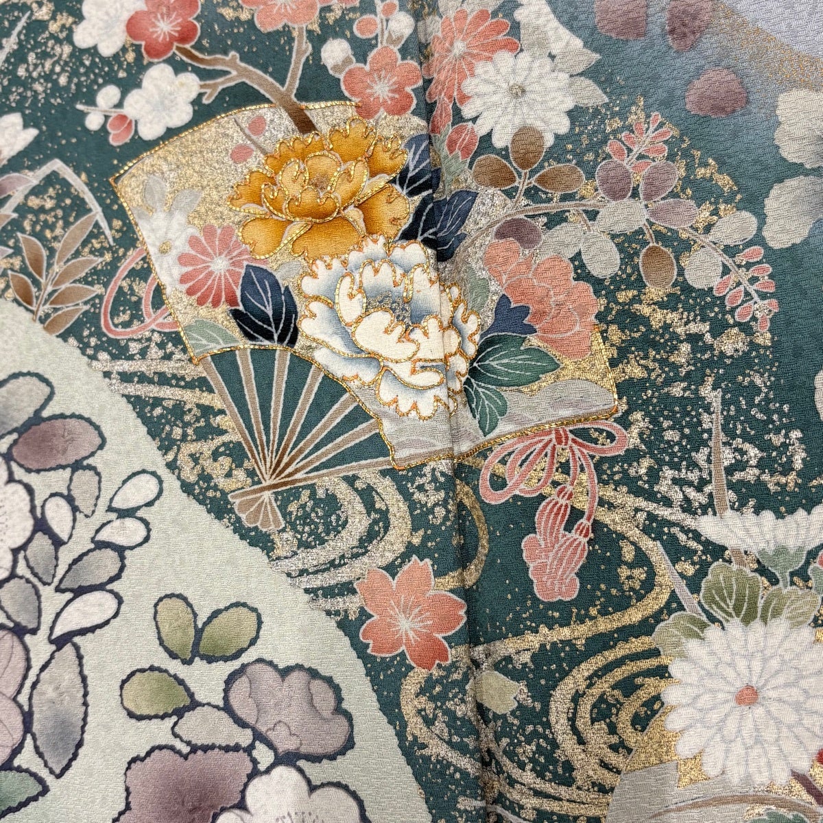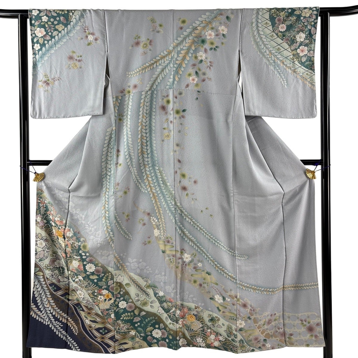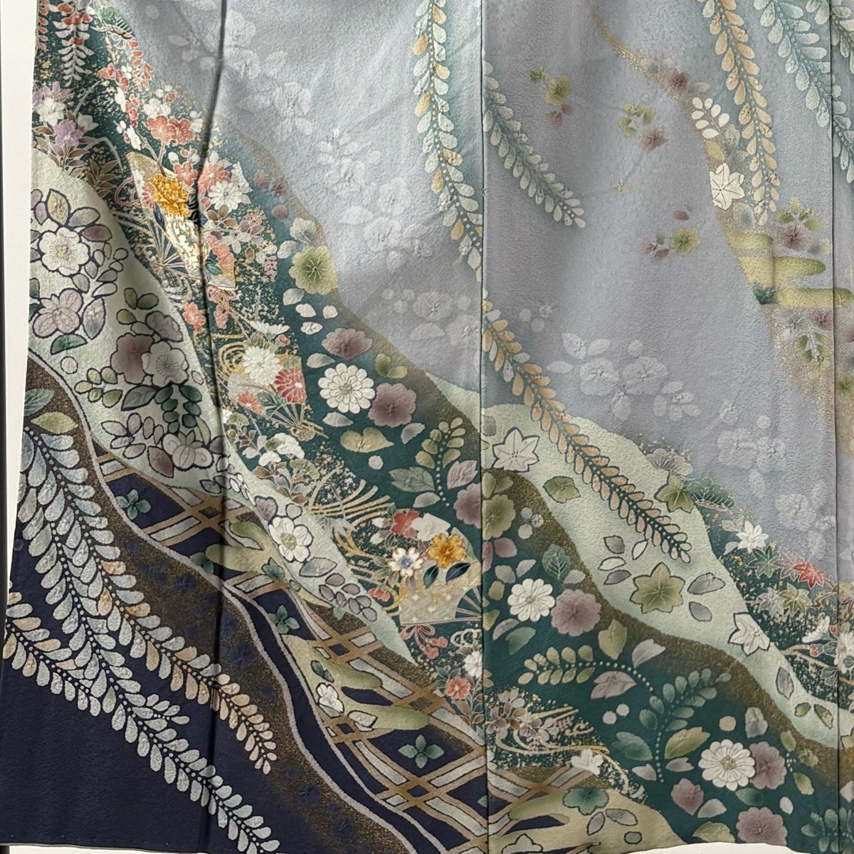 訪問着 身丈164cm 裄丈68cm L 袷 扇面 草花 金彩 青灰色 正絹 名品