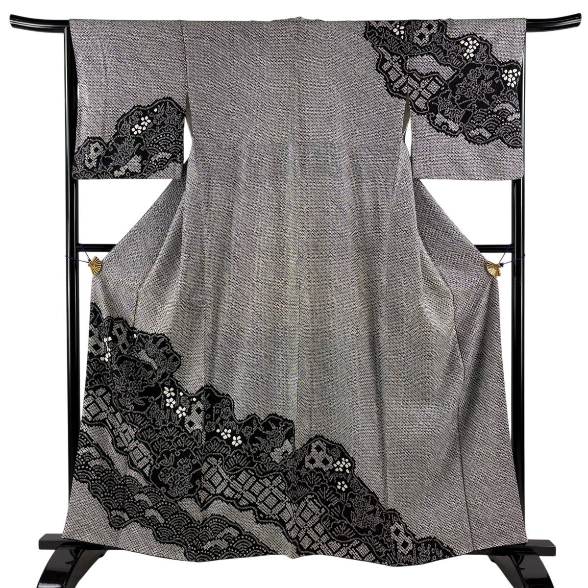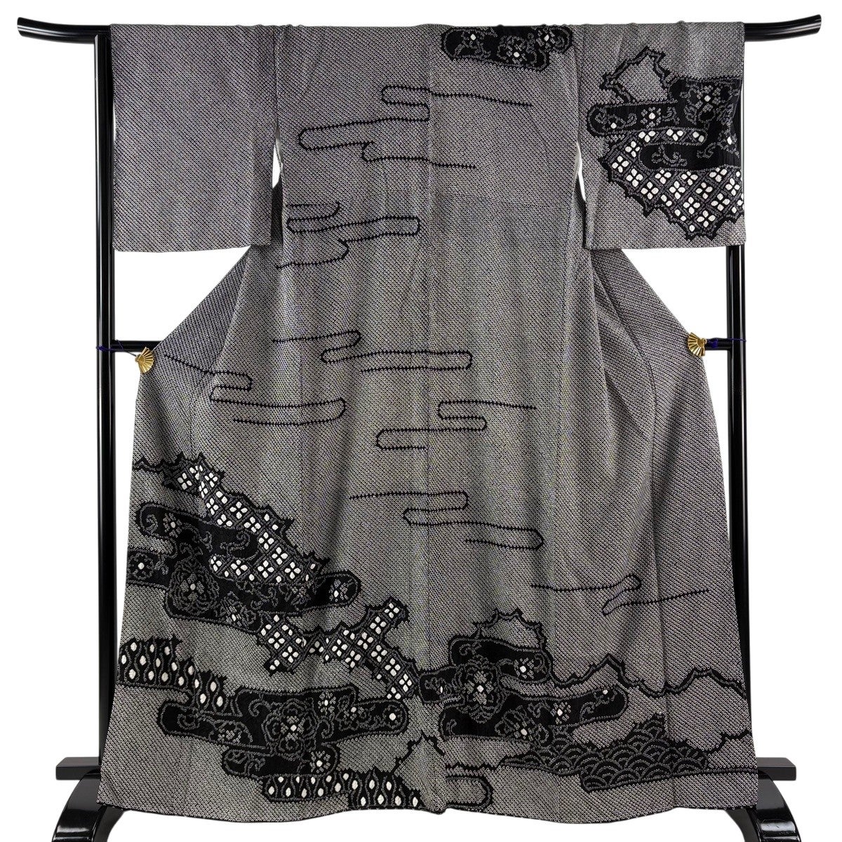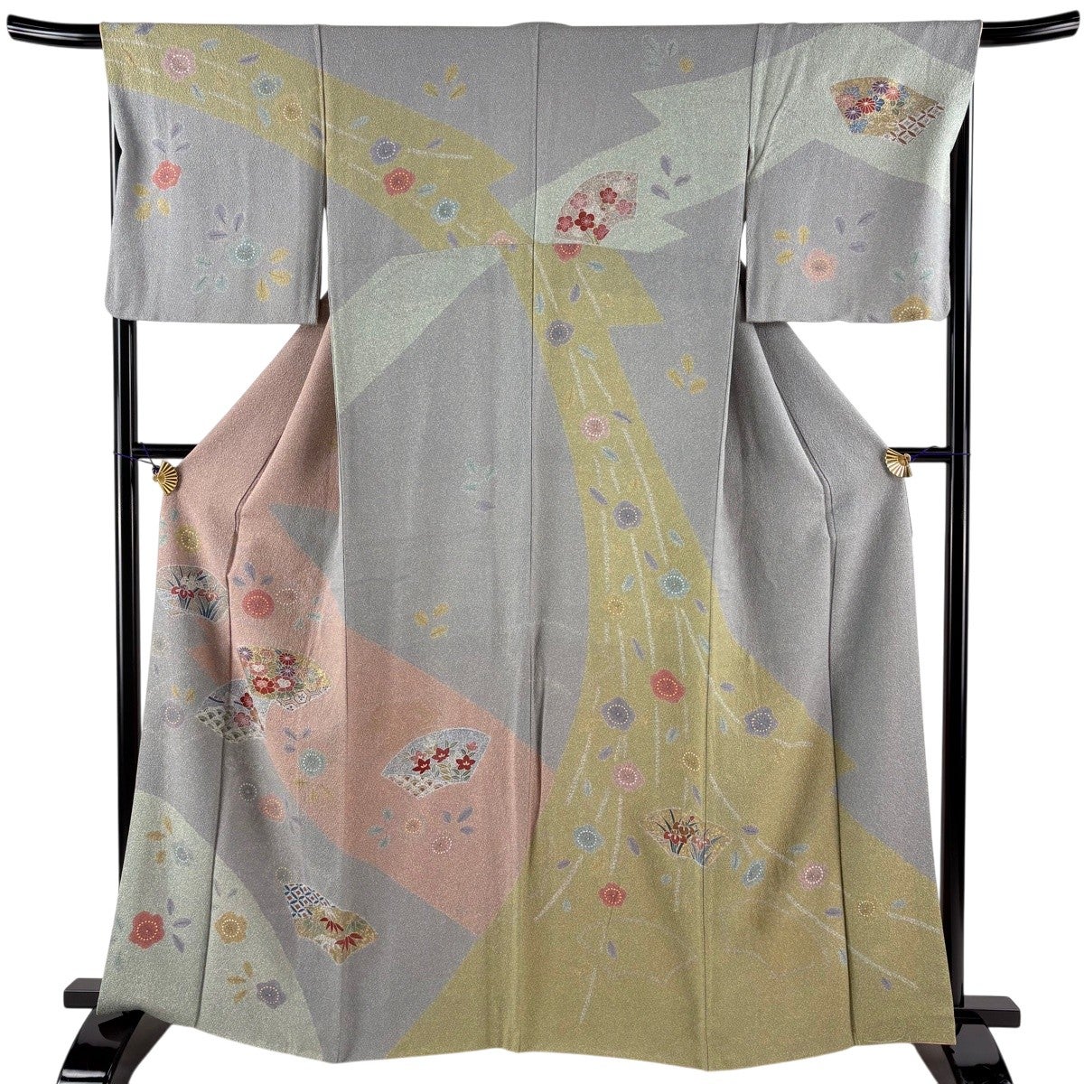 訪問着 身丈159.5cm 裄丈65.5cm M 袷 糸巻 扇 金彩 黒灰 正絹 秀品