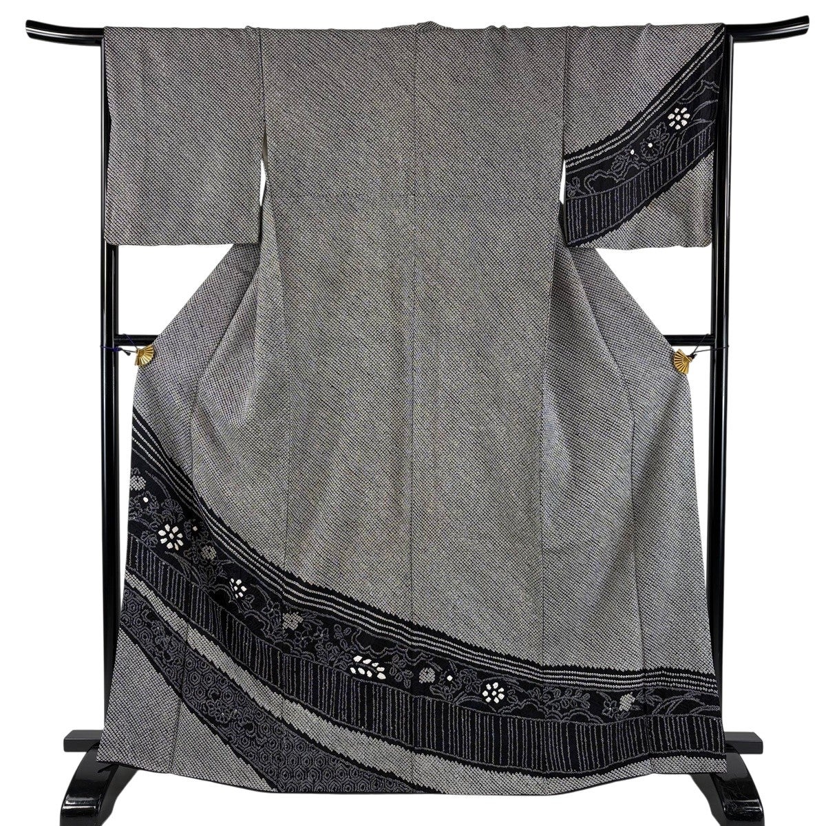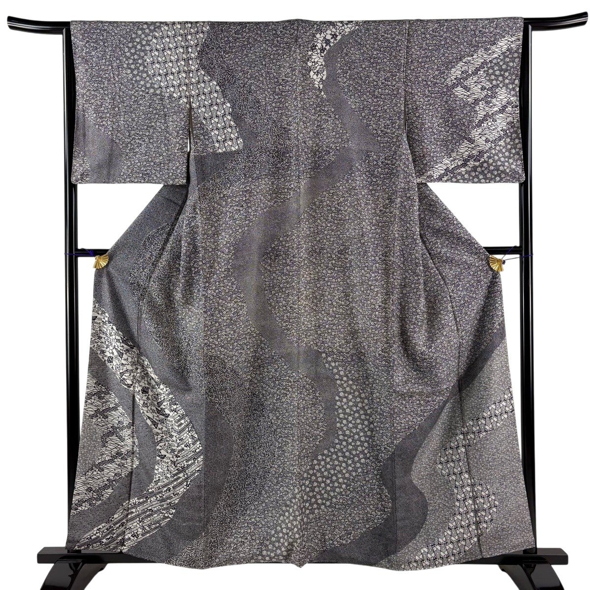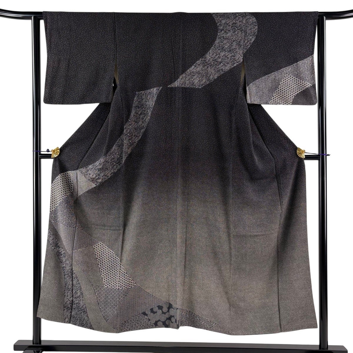 訪問着 身丈159.5cm 裄丈65.5cm M 袷 糸巻 扇 金彩 黒灰 正絹 秀品