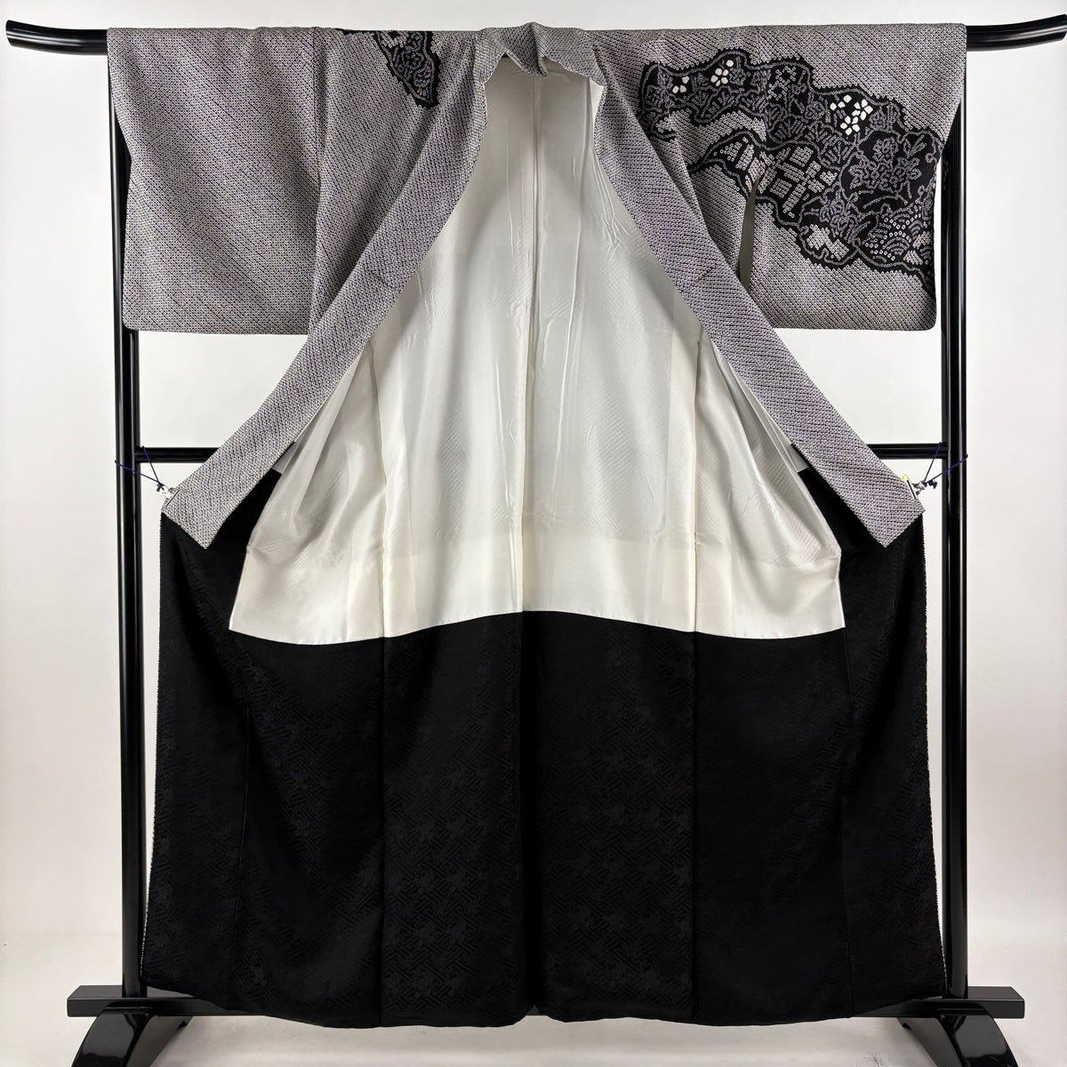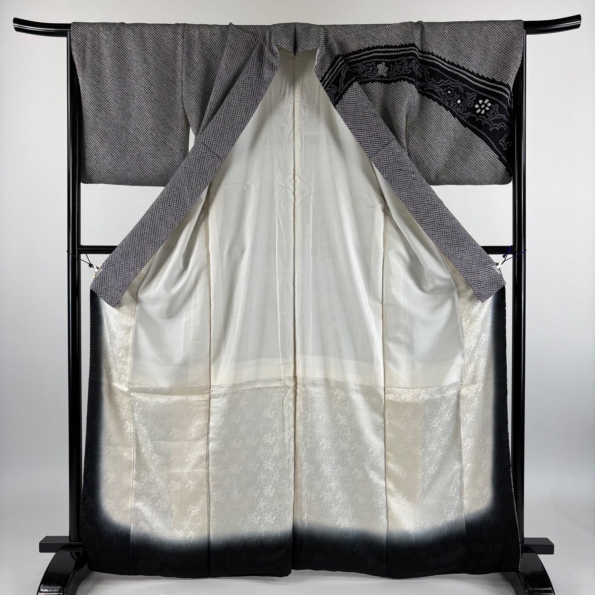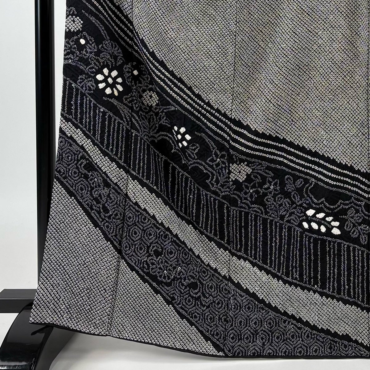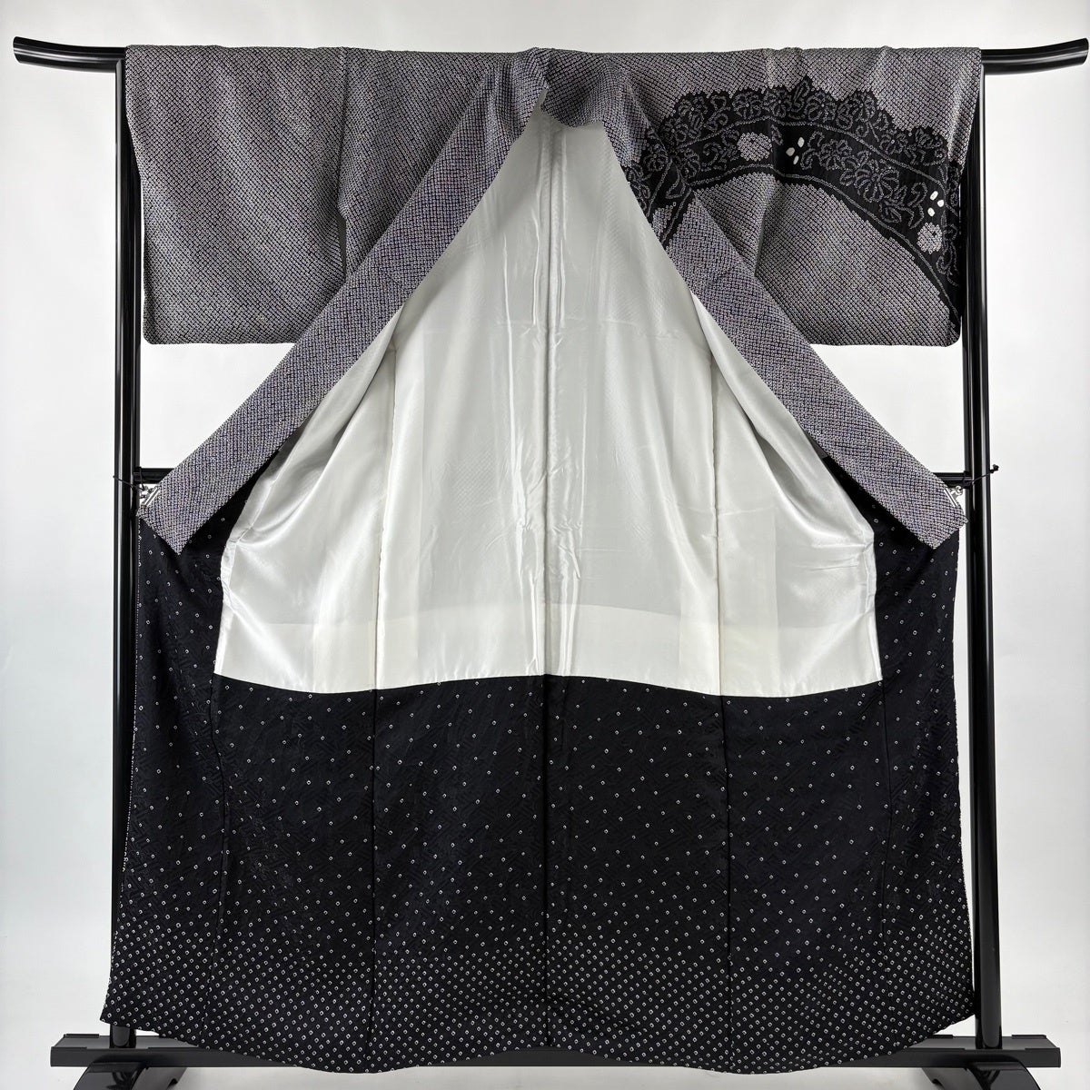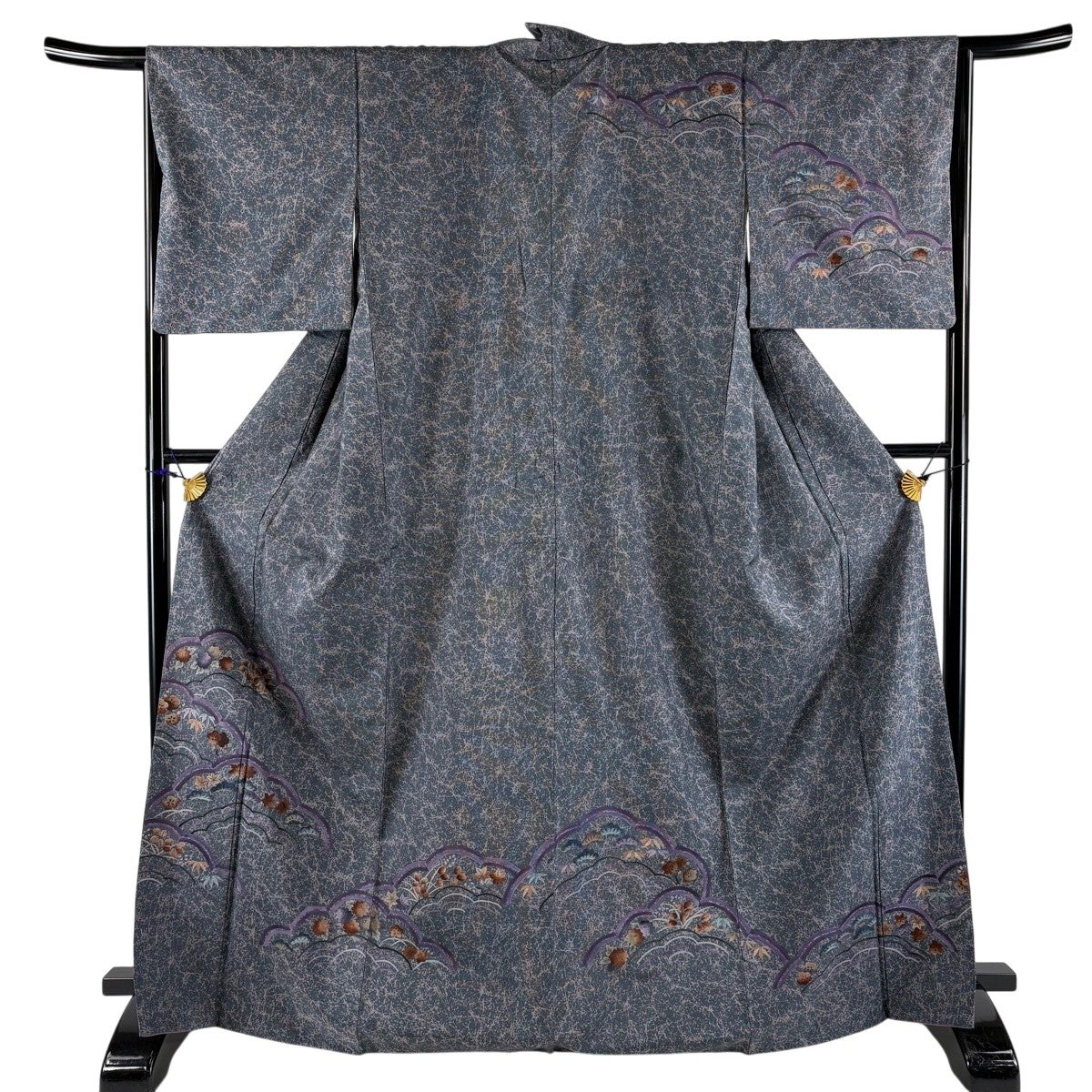 訪問着 身丈162cm 裄丈65cm M 袷 草花 青海波 絞り 黒灰 正絹 秀品