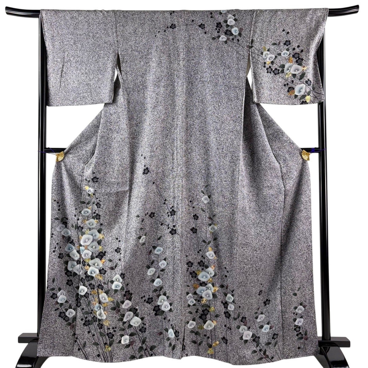 訪問着 身丈152cm 裄丈62cm S 袷 草花 金糸 金銀彩 青灰色 正絹 秀品