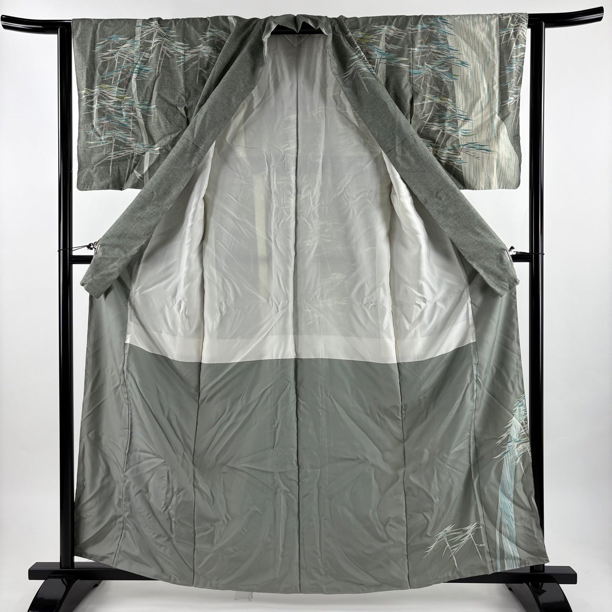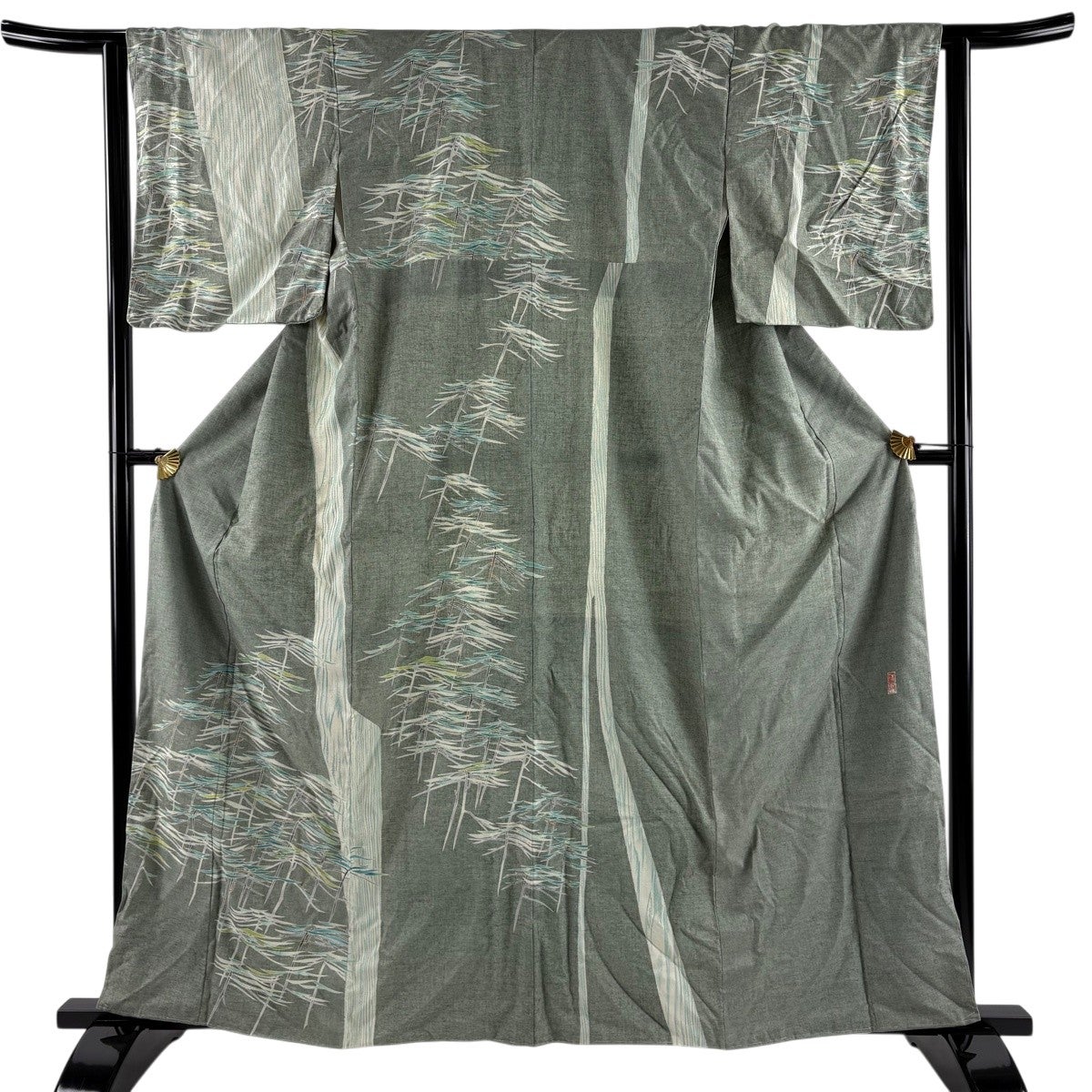 訪問着 身丈163cm 裄丈62cm S 袷 紬地 落款あり 松 灰緑 正絹 名品