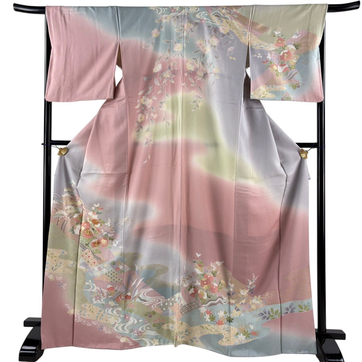 訪問着 身丈164cm 裄丈66cm M 袷 草花 霞 金彩 ピンク 正絹 秀品