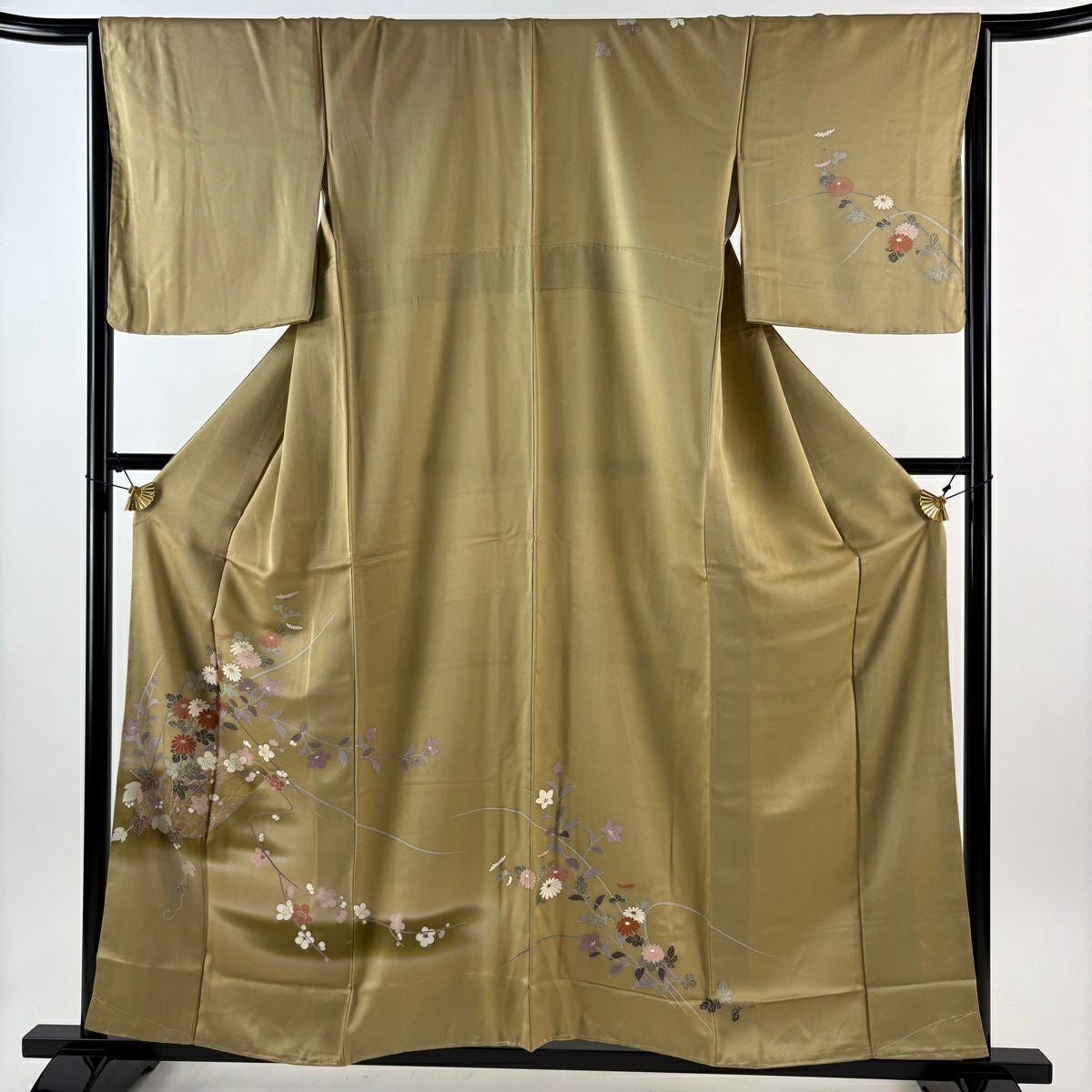 訪問着 身丈164cm 裄丈67.5cm L 袷 扇面 草花 金糸 金銀彩 ベージュ 正絹 秀品