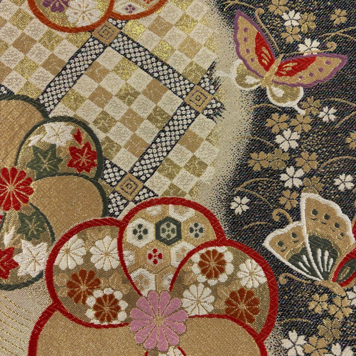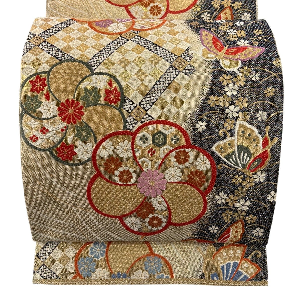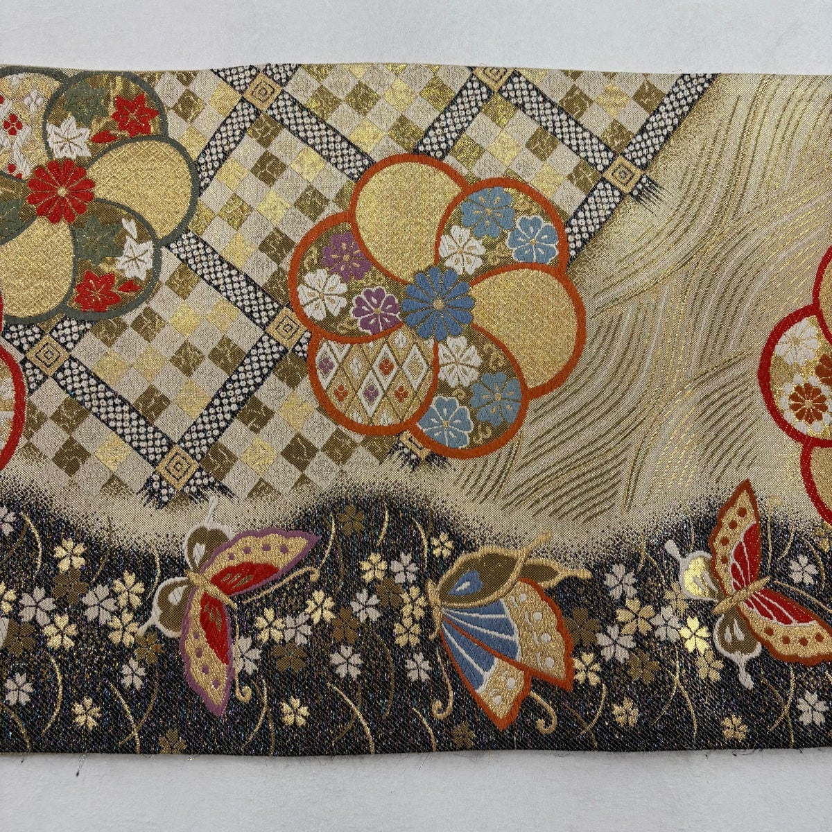 袋帯 名品 花唐草 市松 金糸 箔 ベージュ 六通 正絹