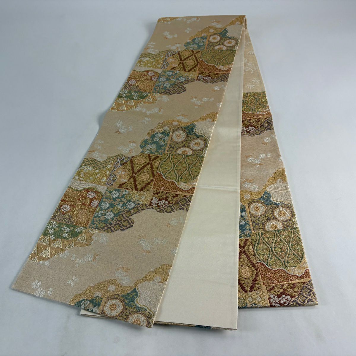 【美品】 袋帯 名品 名物裂全通柄 花鳥 七宝 箔 ベージュ 全通 正絹