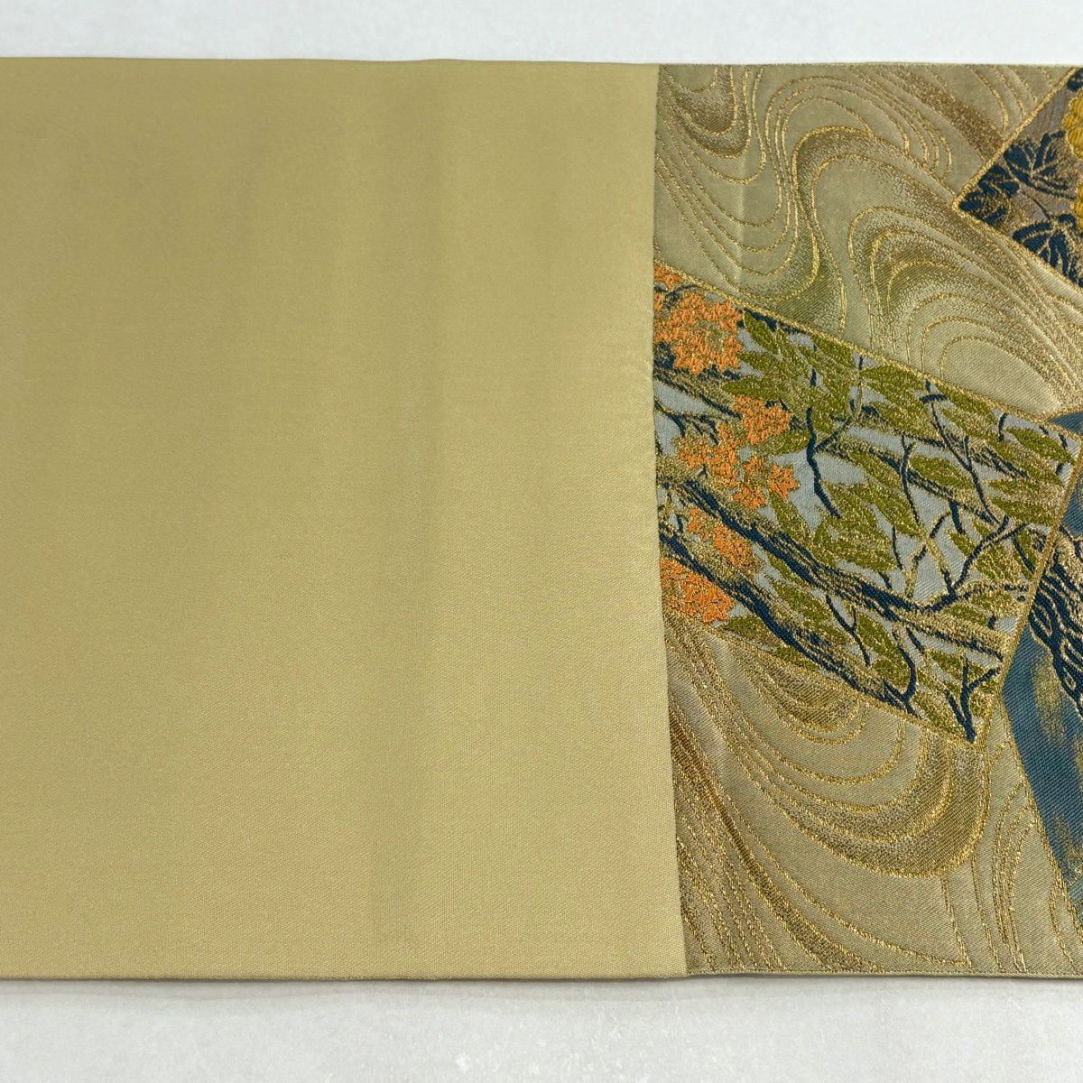 【美品】 袋帯 秀品 関西仕立て 雪輪 草花 金糸 箔 ベージュ 六通 正絹