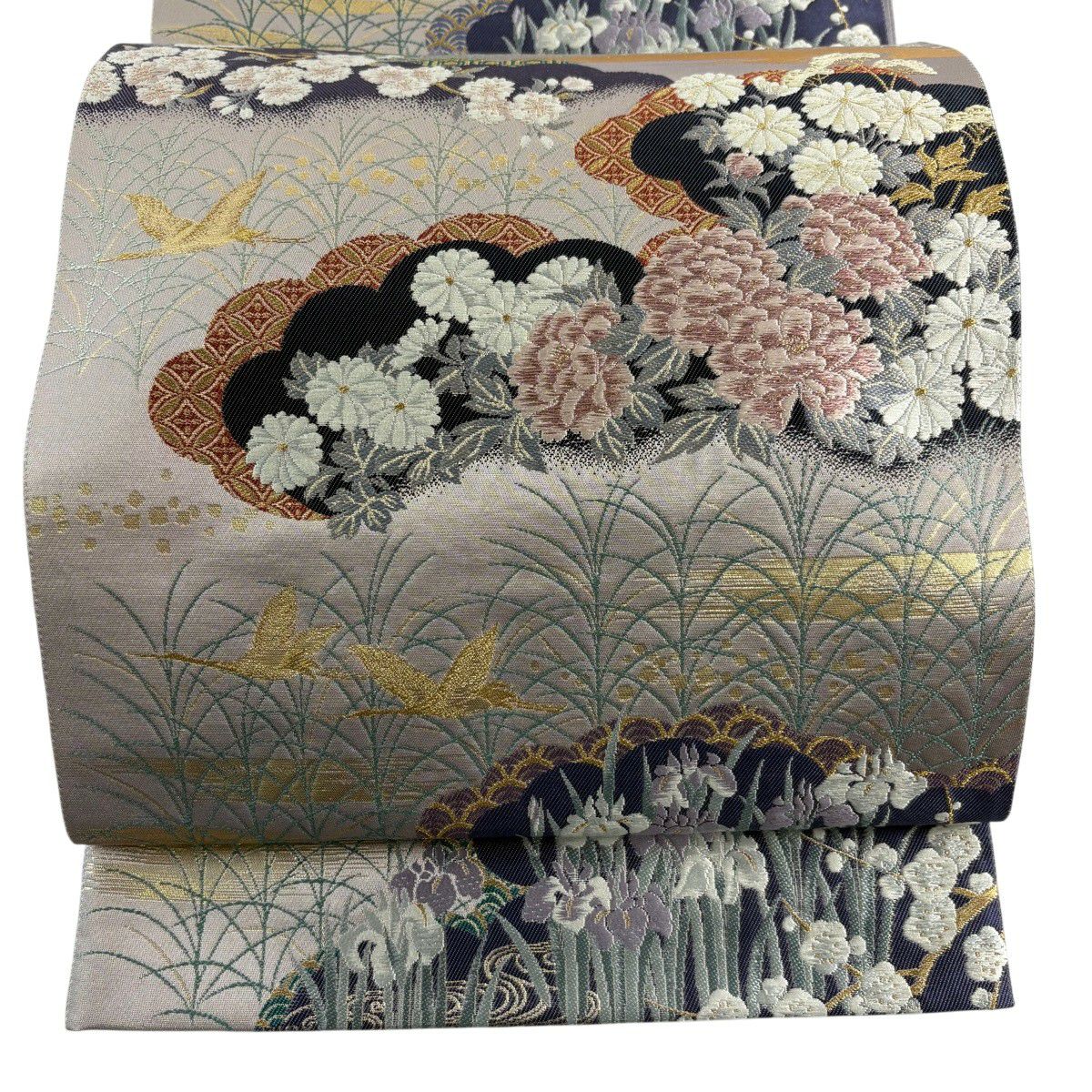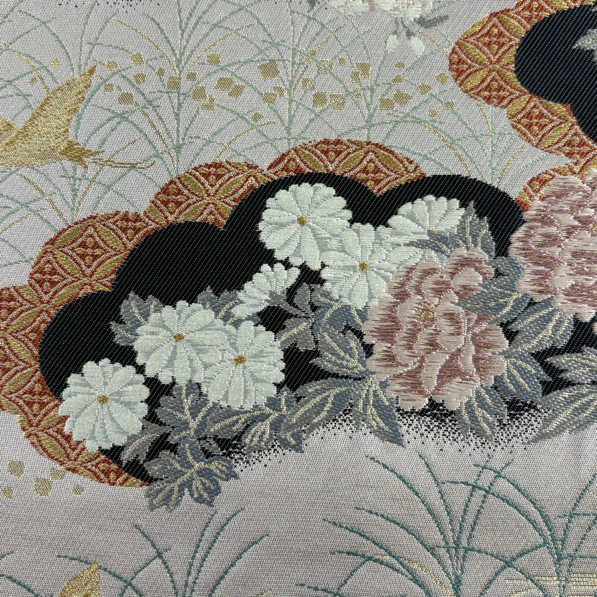 袋帯 秀品 花丸文 草花 金糸 箔 銀色 六通 正絹