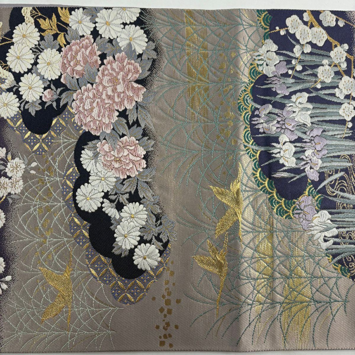 袋帯 名品 夏帯 扇面 花鳥 金糸 銀糸 墨色 六通 正絹