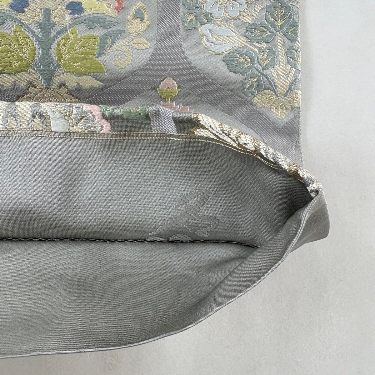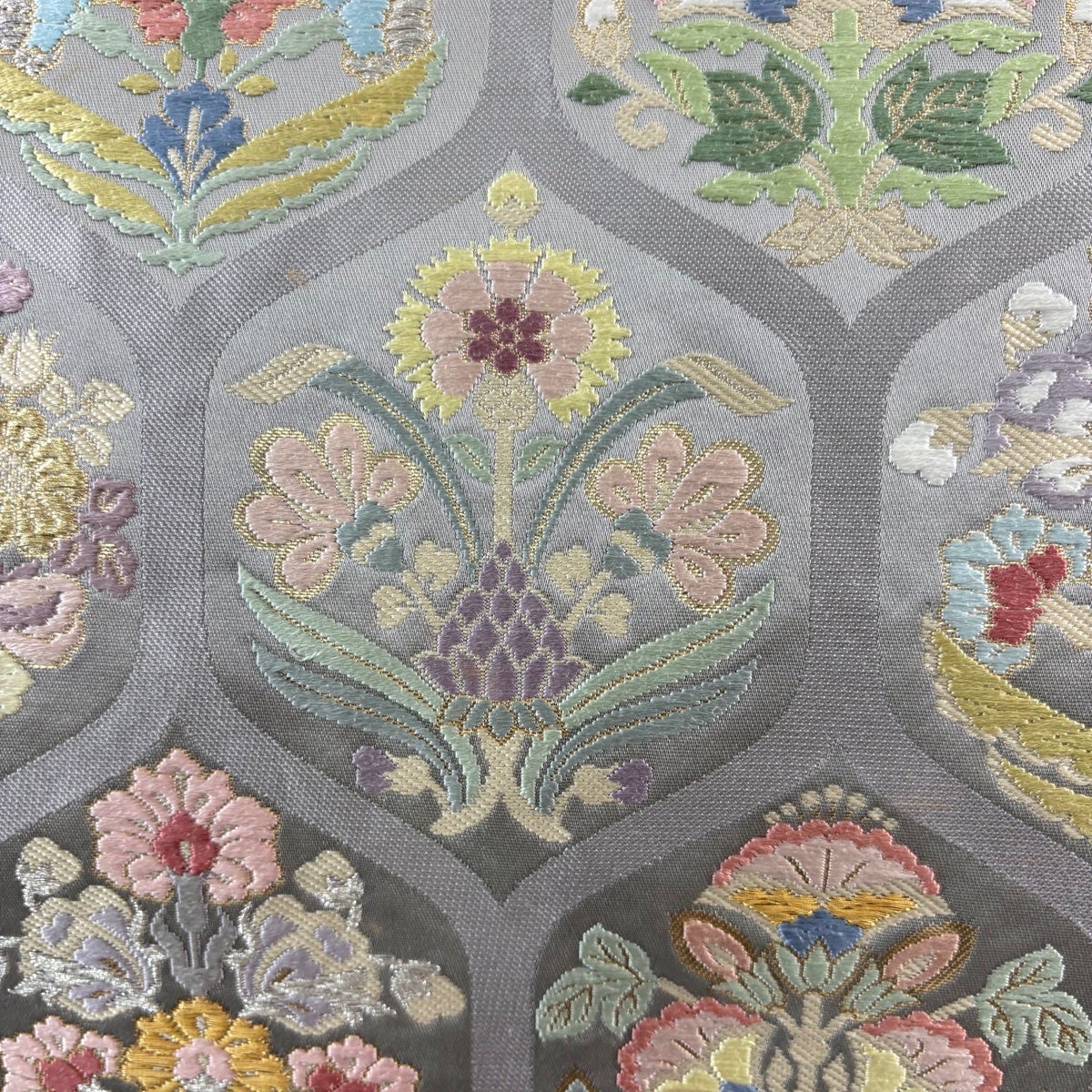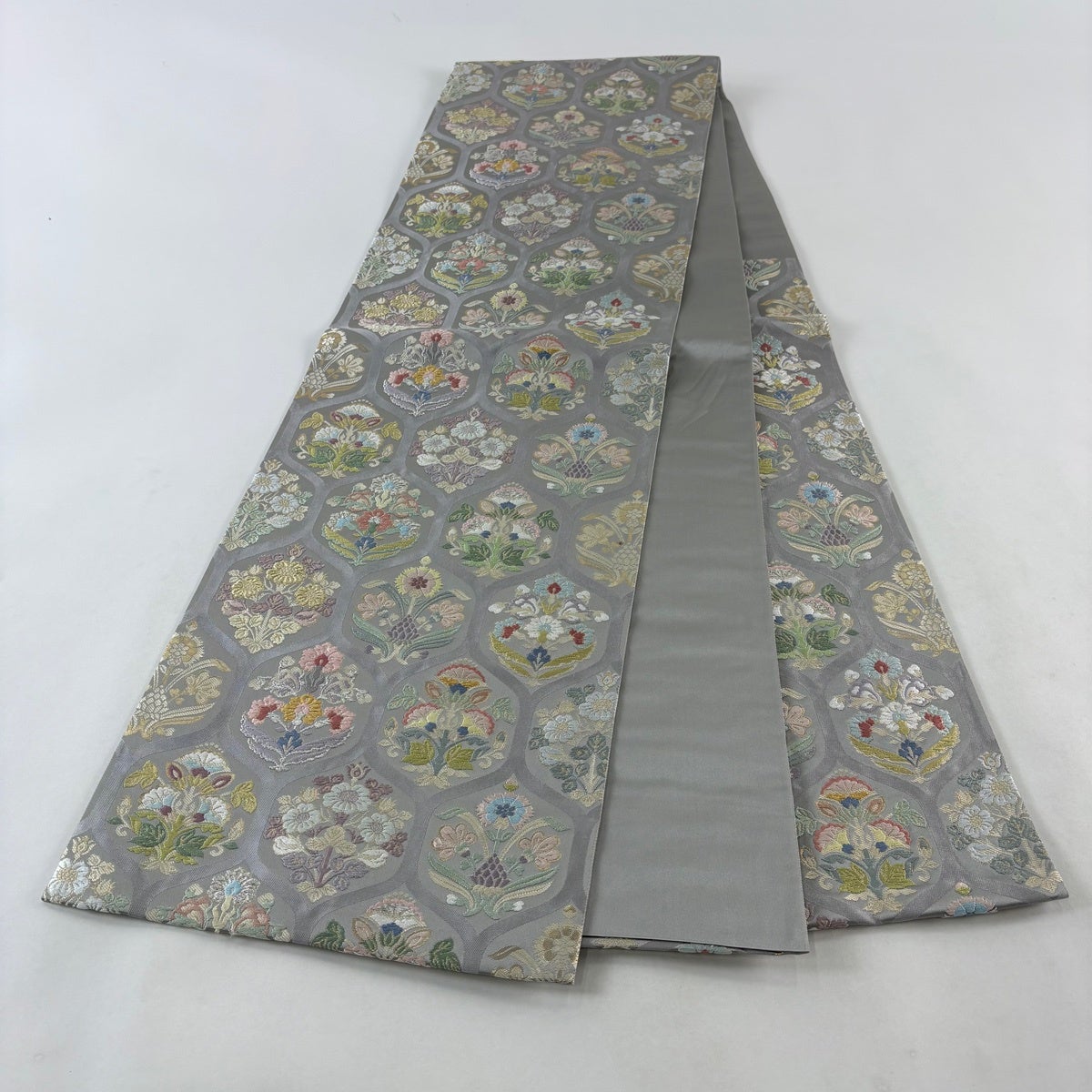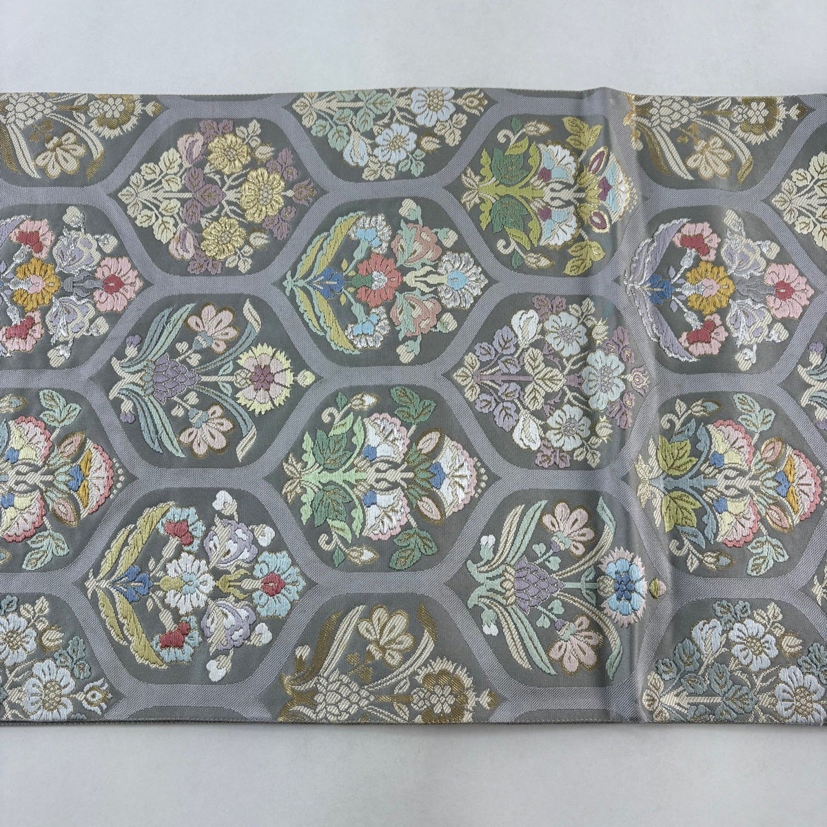 袋帯 秀品 亀甲 草花 唐織 金銀糸 灰色 六通 正絹