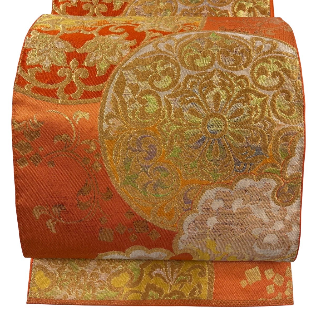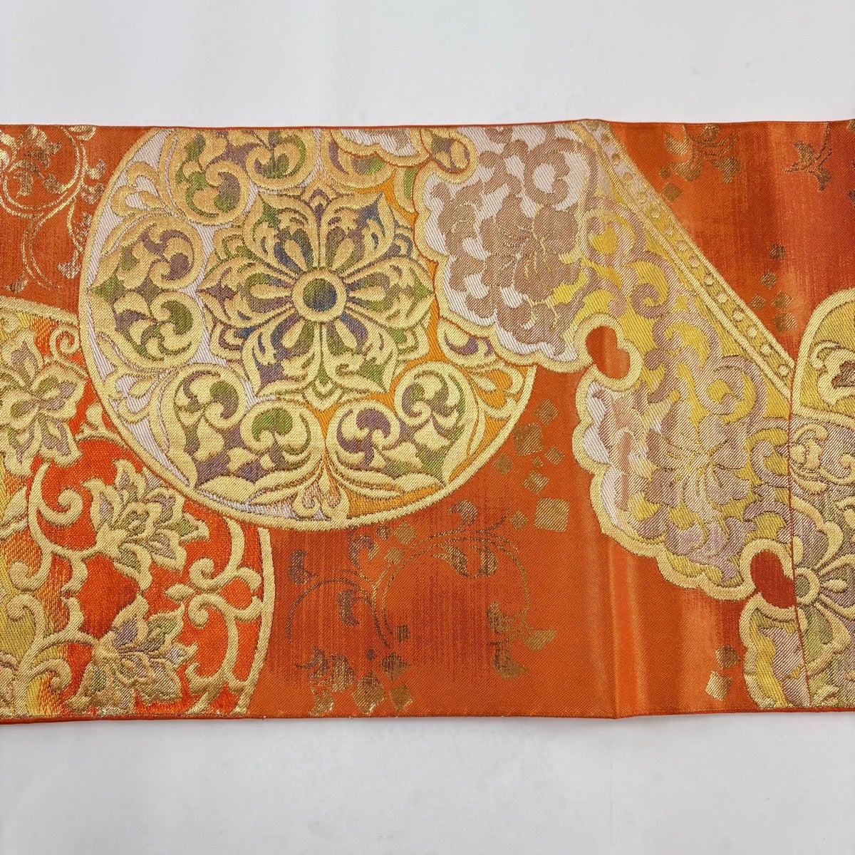 【美品】 袋帯 秀品 華文 蜀江文 金糸 箔 薄オレンジ 六通 正絹