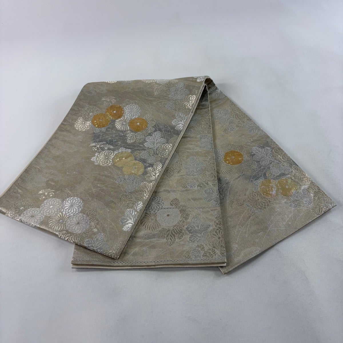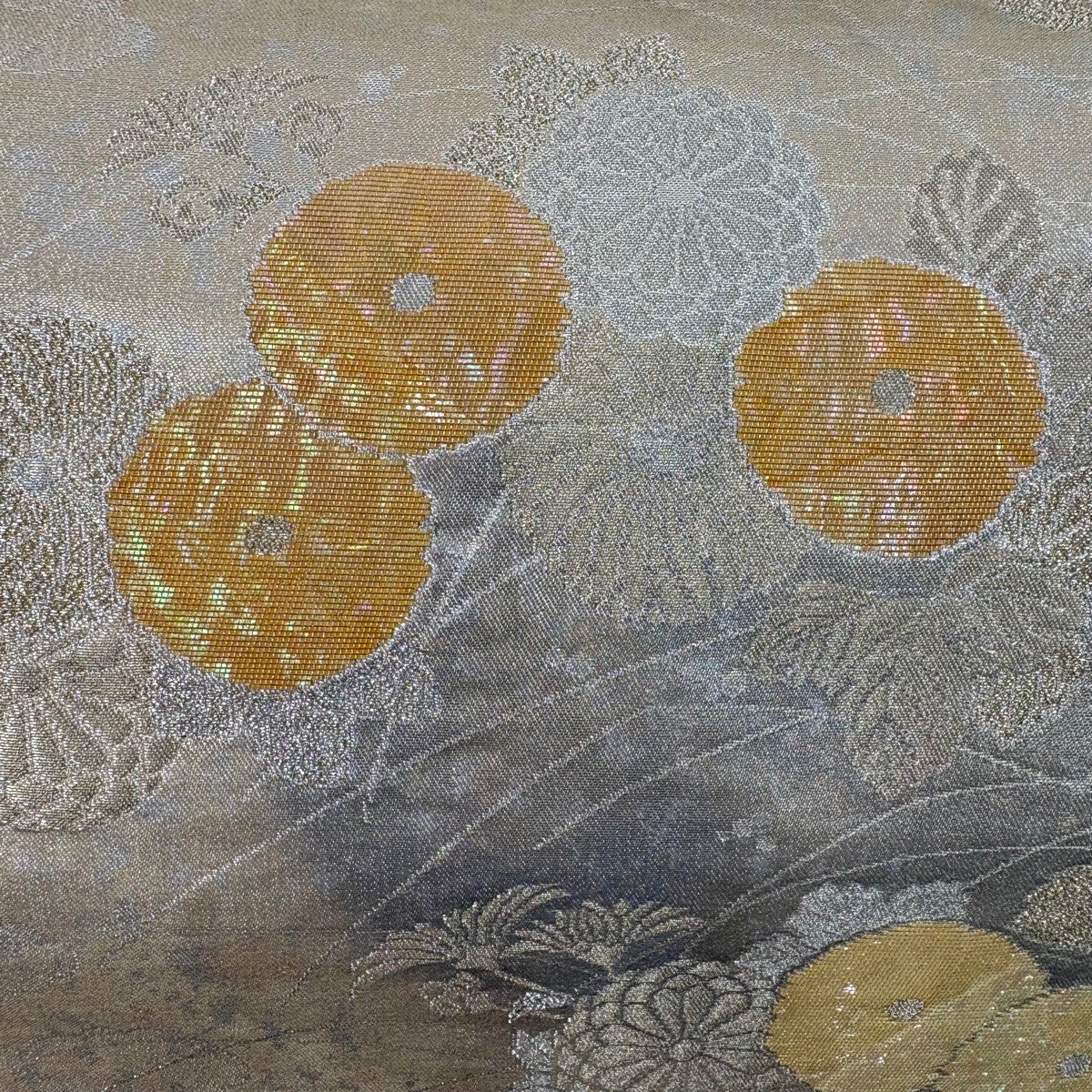 袋帯 秀品 桜 花丸文 金糸 唐織 灰色 六通 正絹