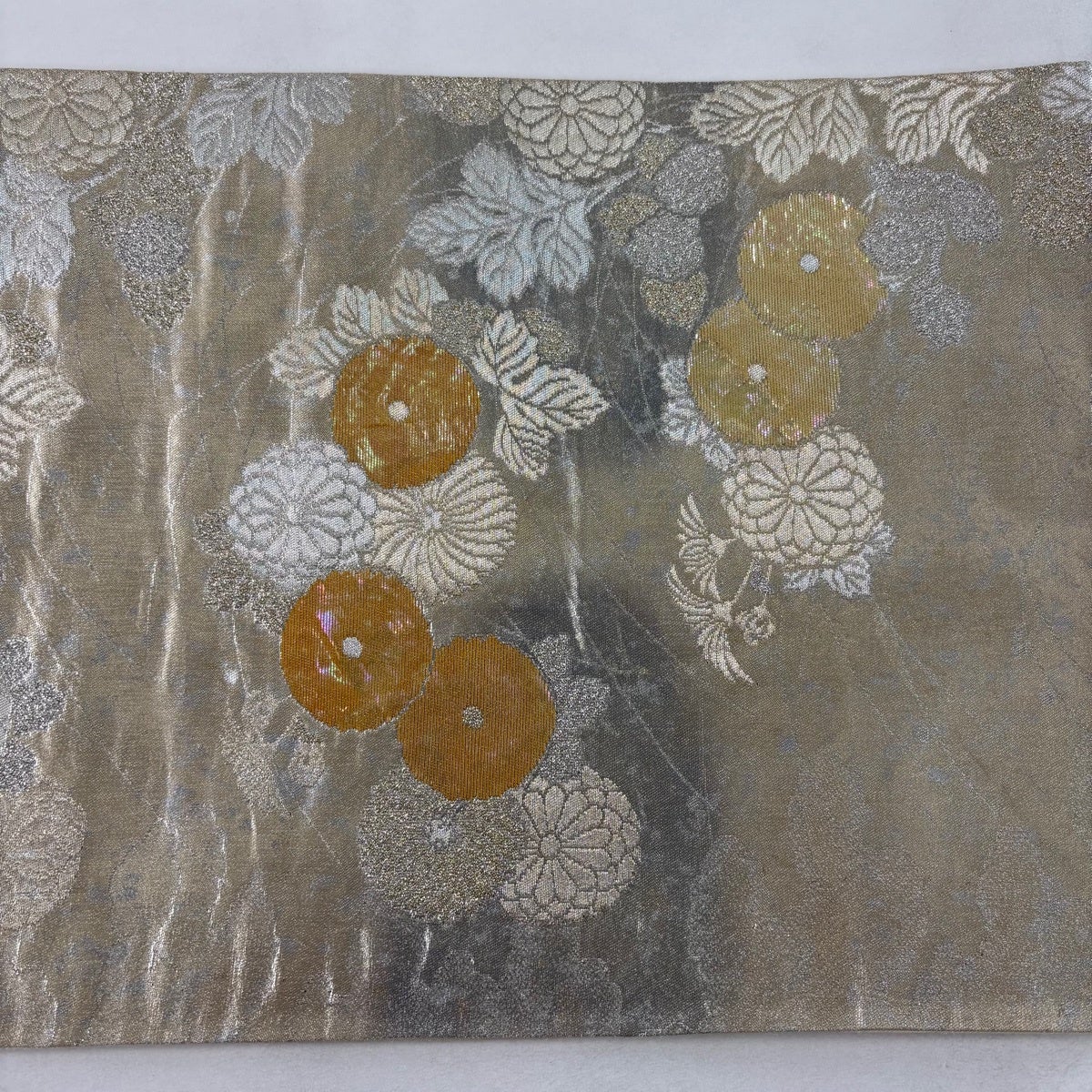 【美品】 袋帯 秀品 鳳凰 菊 金糸 刺繍 銀色 六通 正絹