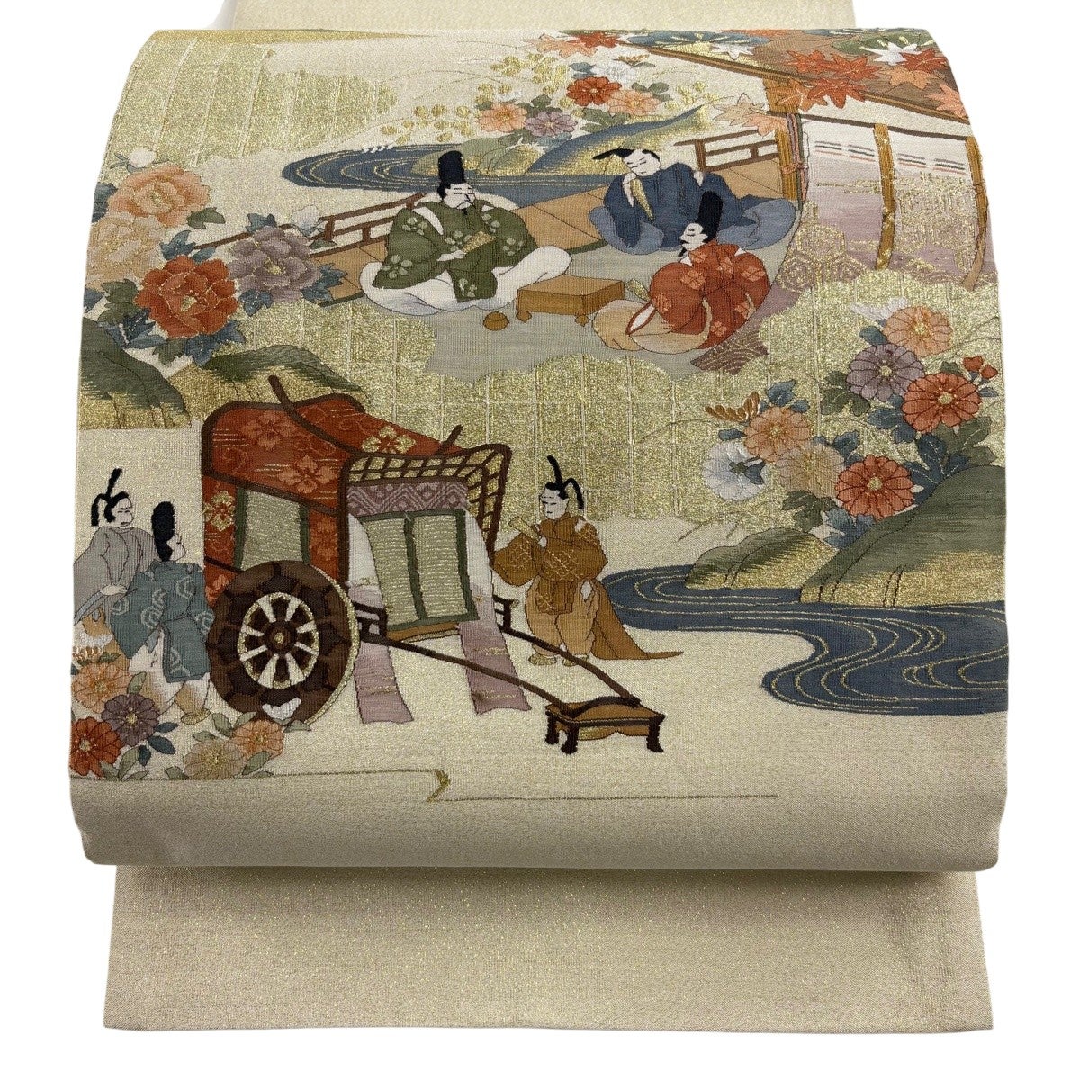 袋帯 秀品 振袖向き 花 流水 箔 白 六通 正絹