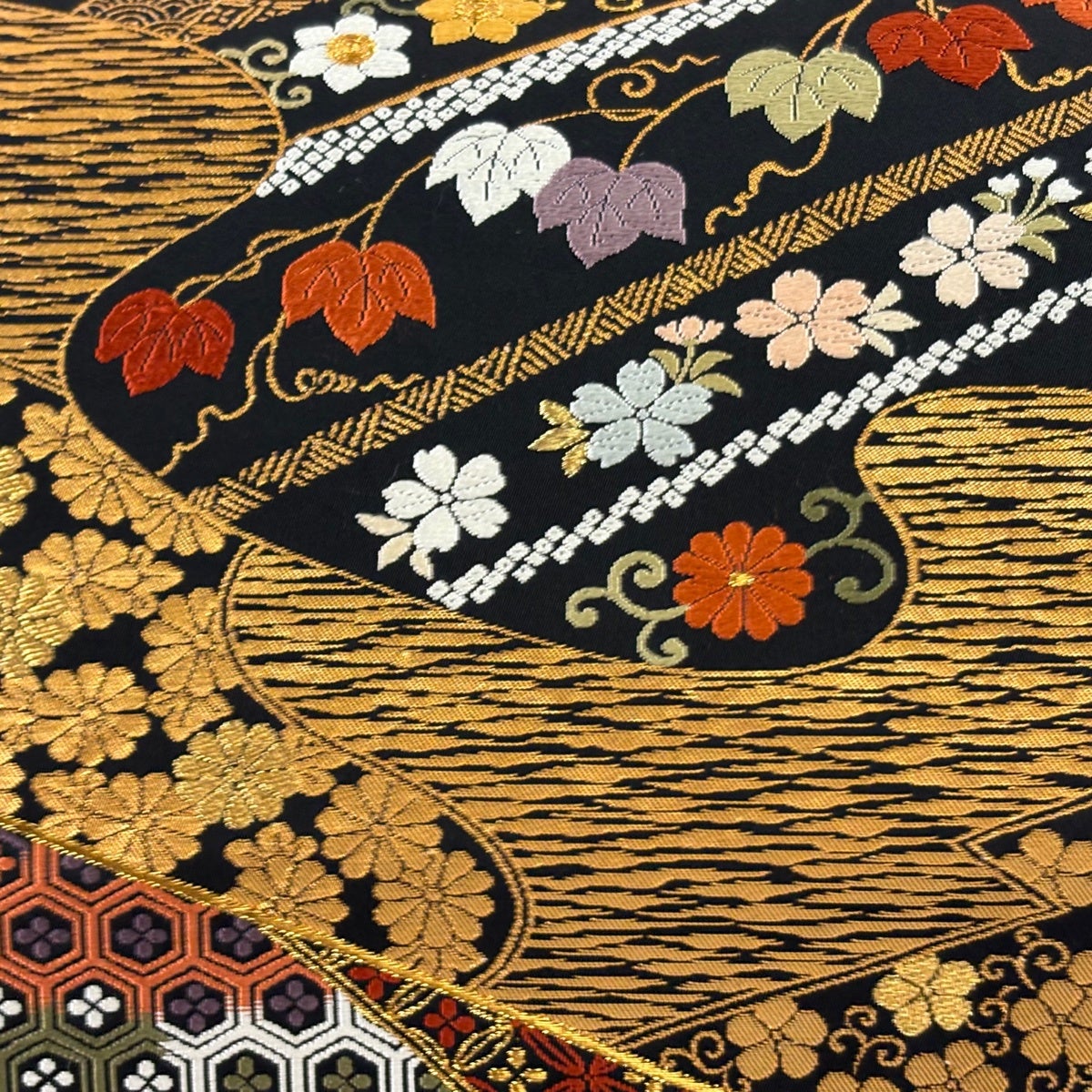 【美品】 袋帯 秀品 束ね熨斗 和楽器 箔 唐織 黒 六通 正絹