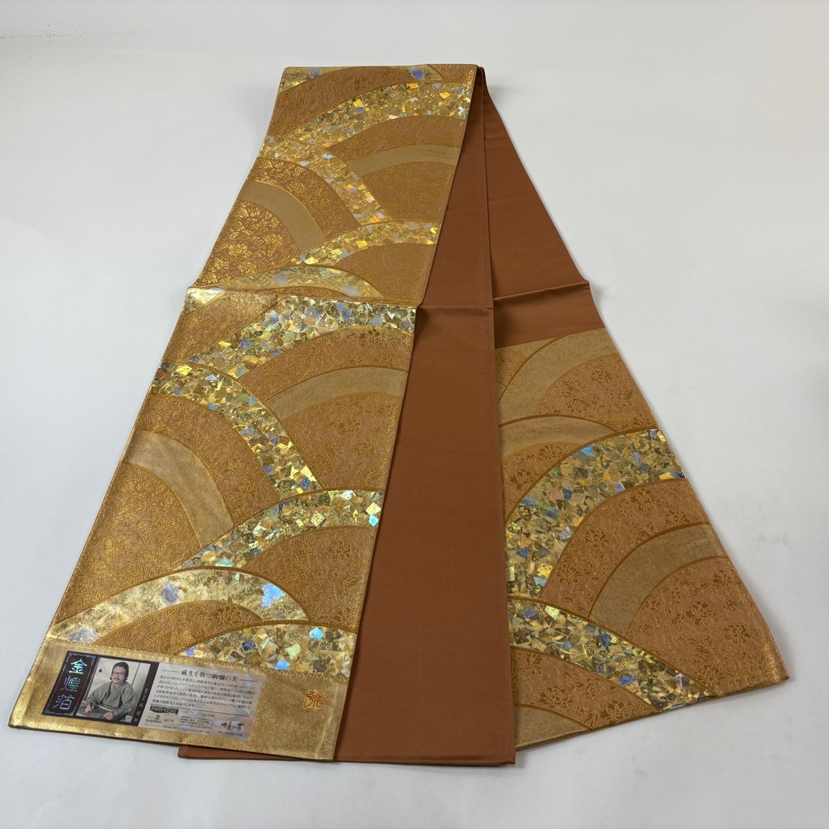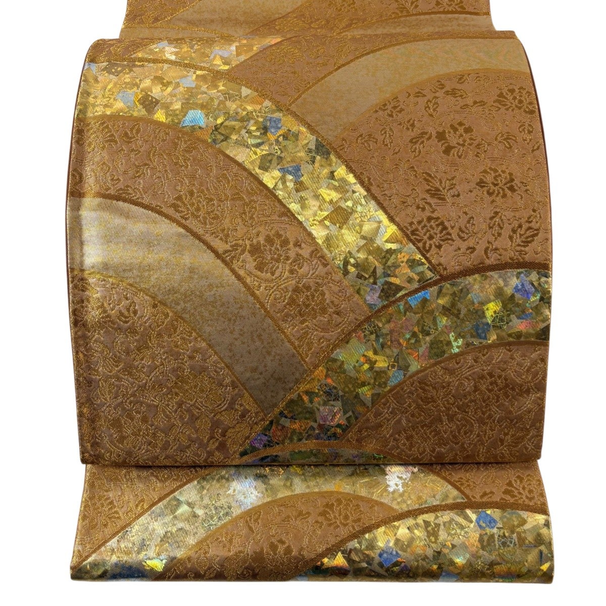 【美品】 袋帯 名品 堀省平 落款あり 証紙あり 花唐草 幾何学 金煌箔 薄茶色 六通 正絹