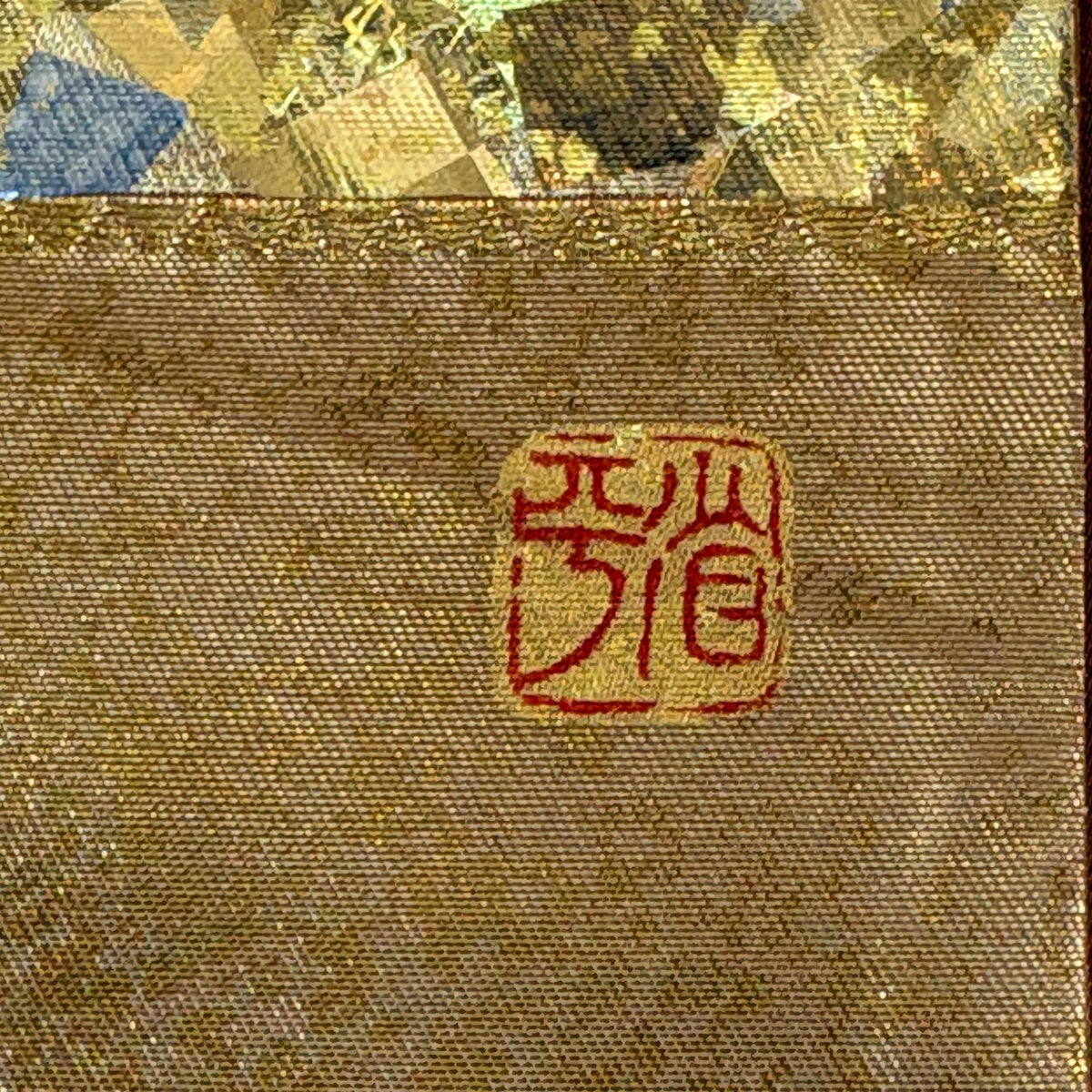 【美品】 袋帯 名品 じゅらく 落款あり 扇面 霞 金糸 箔 よもぎ色 六通 正絹