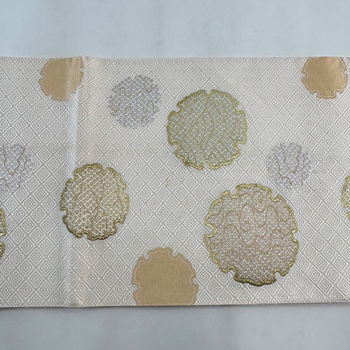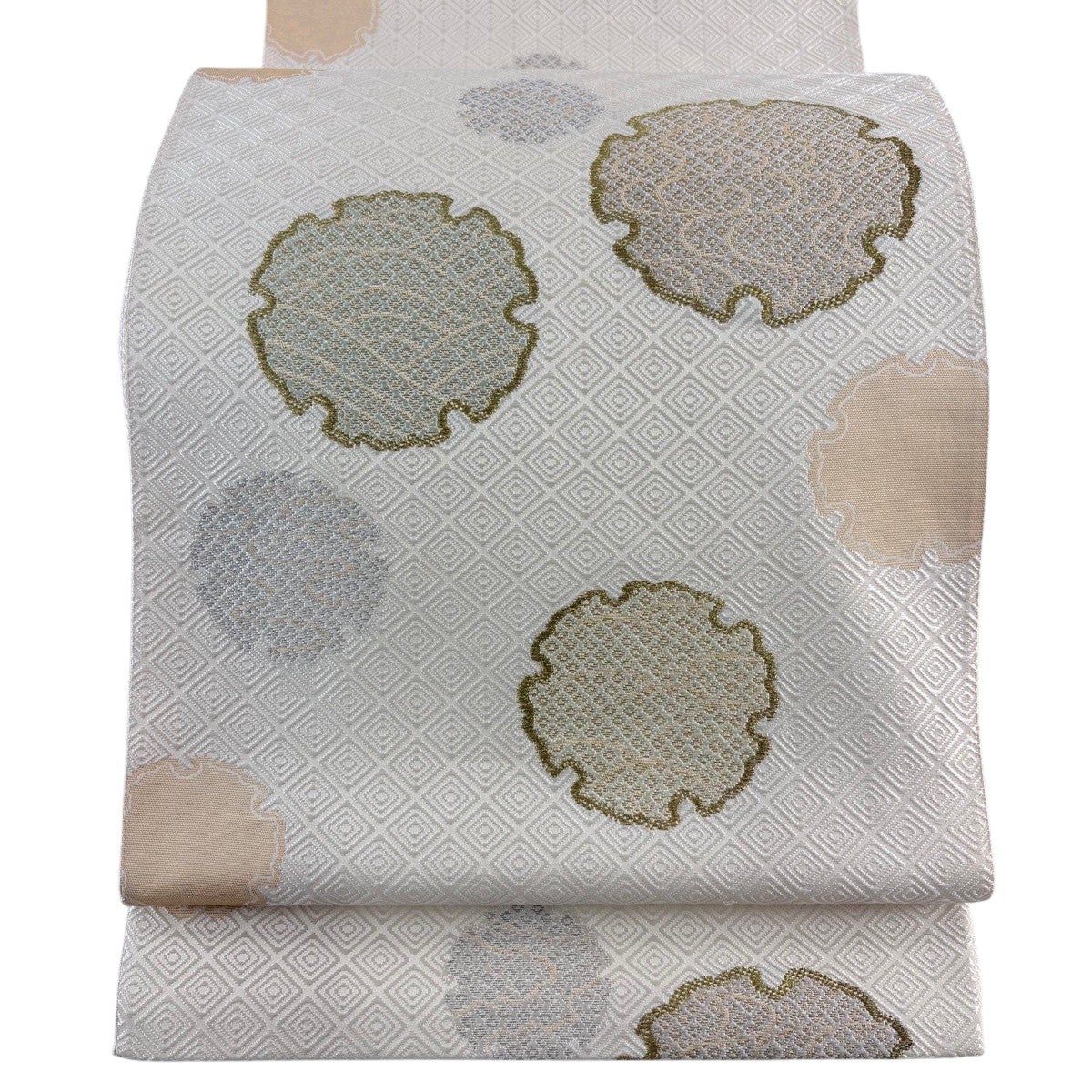 袋帯 秀品 花丸文 波 箔 銀色 六通 正絹