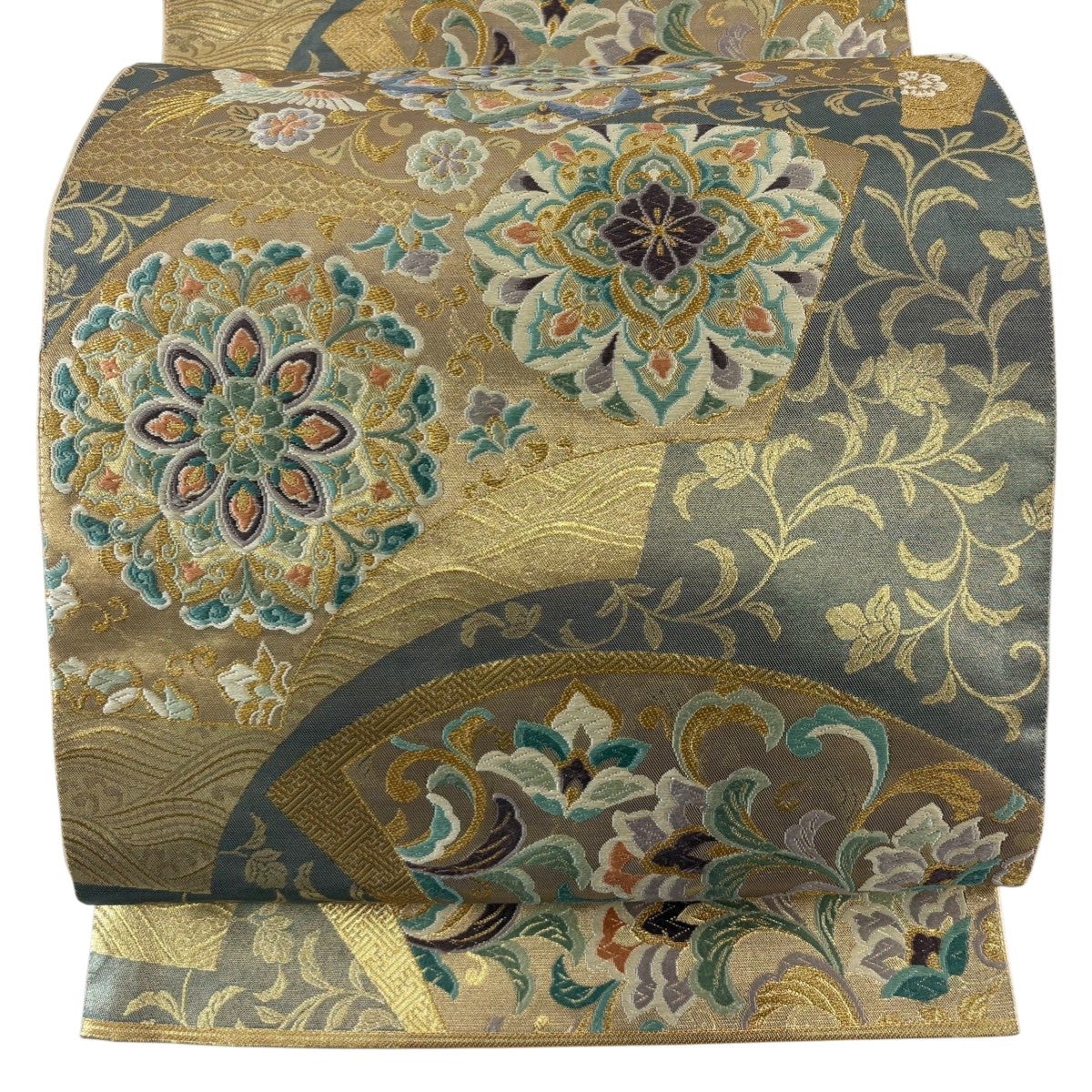袋帯 秀品 関西仕立て 花丸文 向かい鶴 金糸 箔 ベージュ 六通 正絹