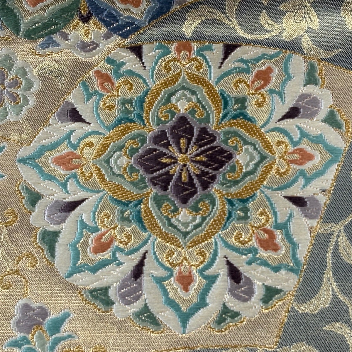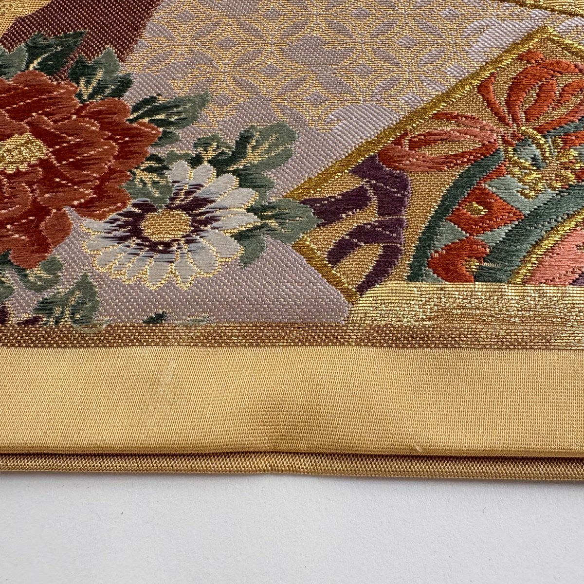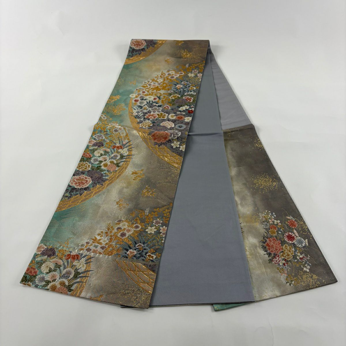 袋帯 秀品 秋草 籠目 刺繍 金糸 灰紫 六通 正絹