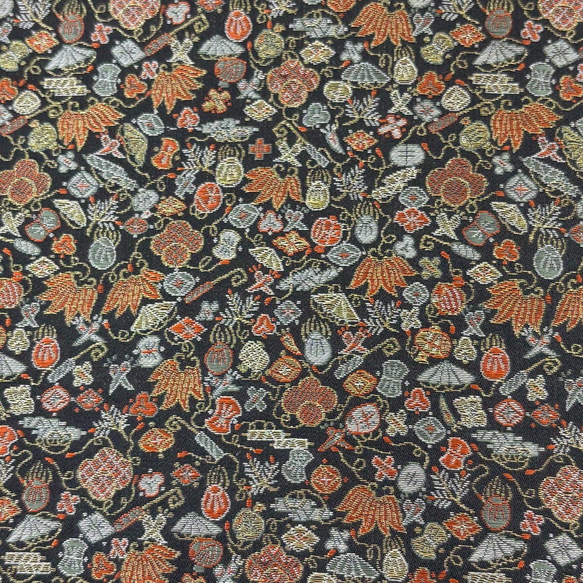 袋帯 秀品 扇 草花 金銀糸 刺繍 黒 六通 正絹