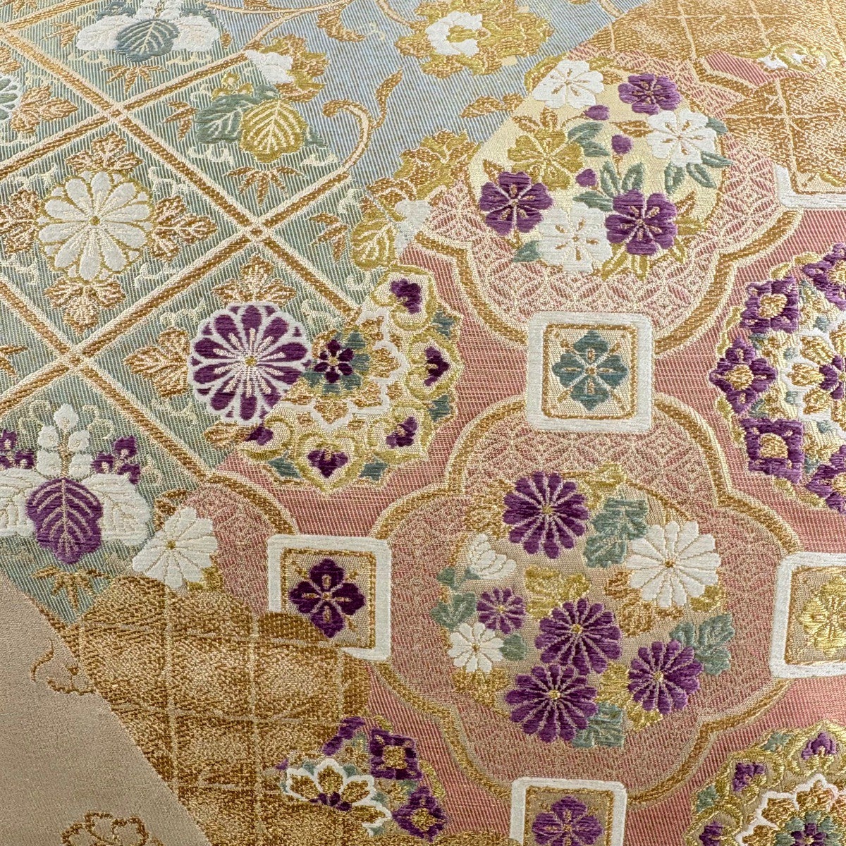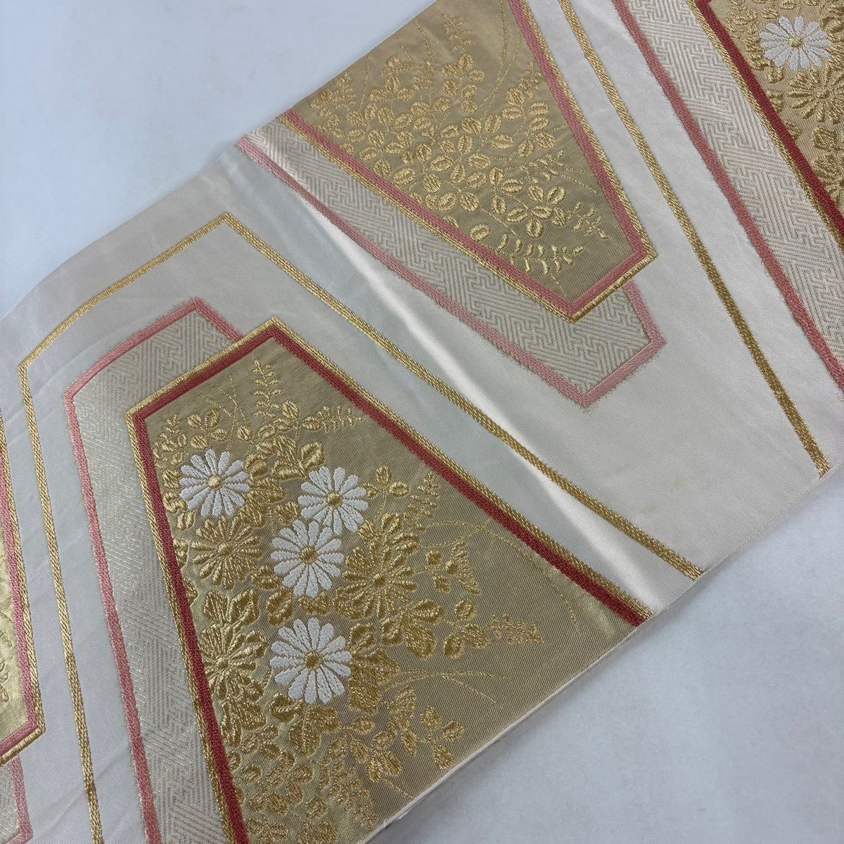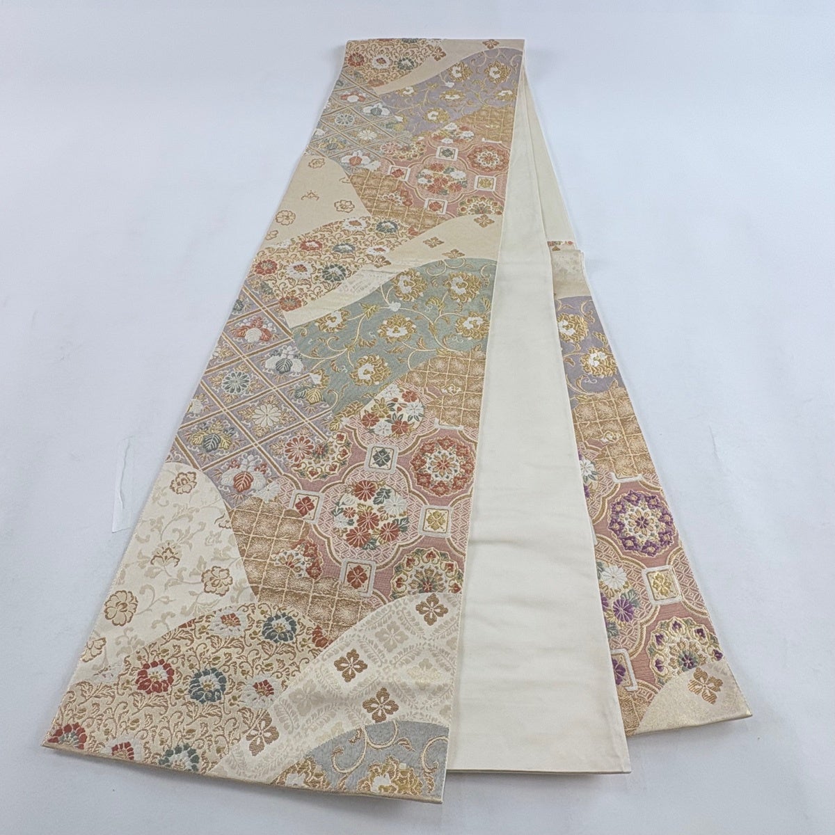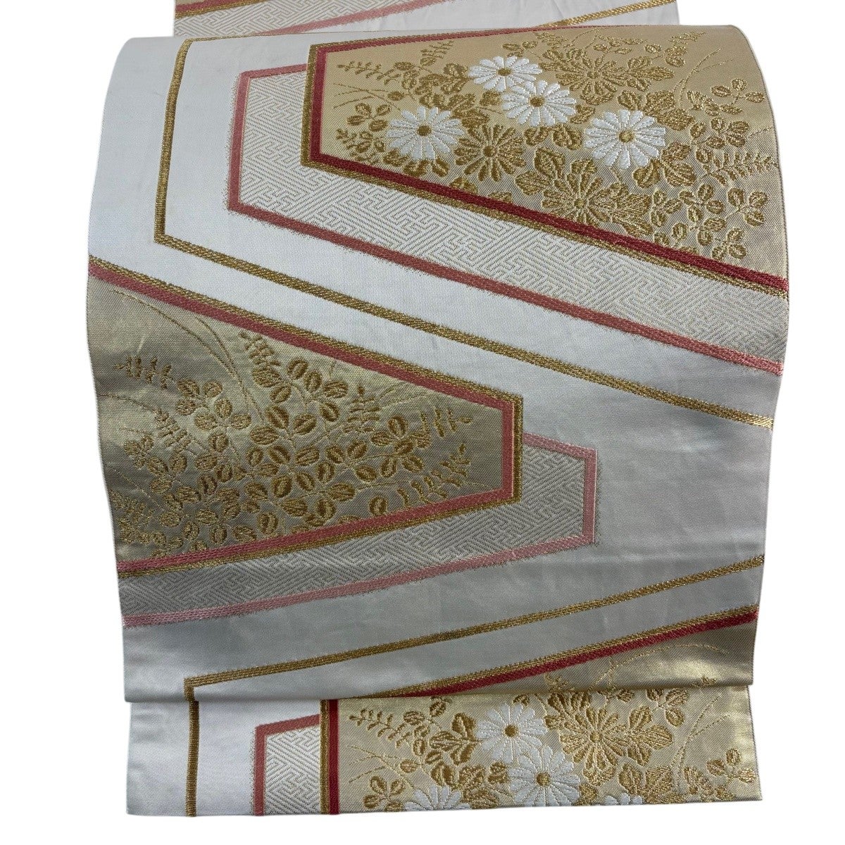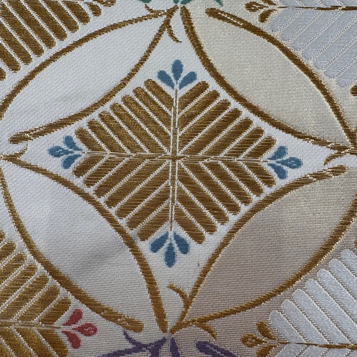 40%OFF 袋帯 逸品 白綾苑大庭 落款あり 花亀甲 花菱 唐織 金糸 銀色 六通 正絹 K30