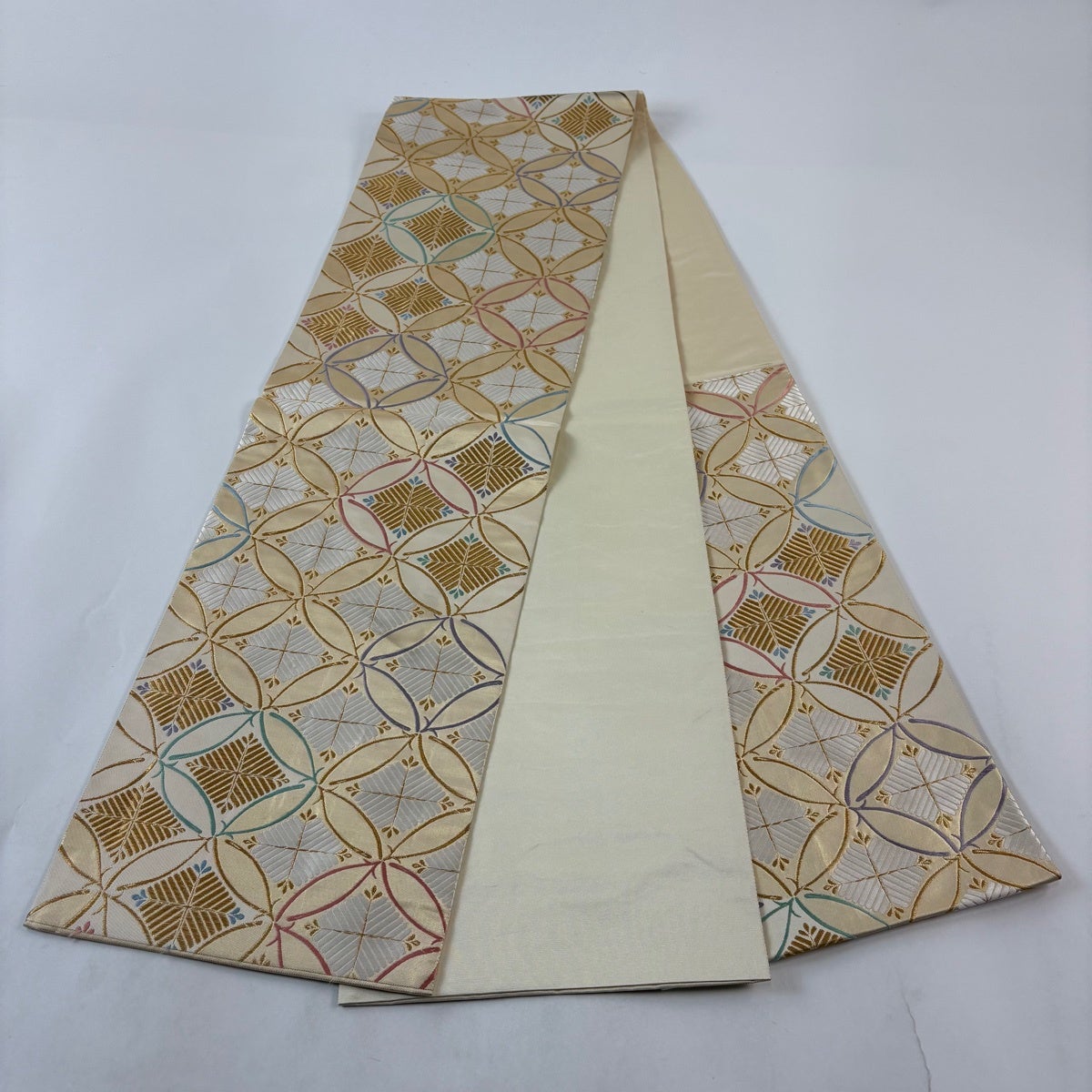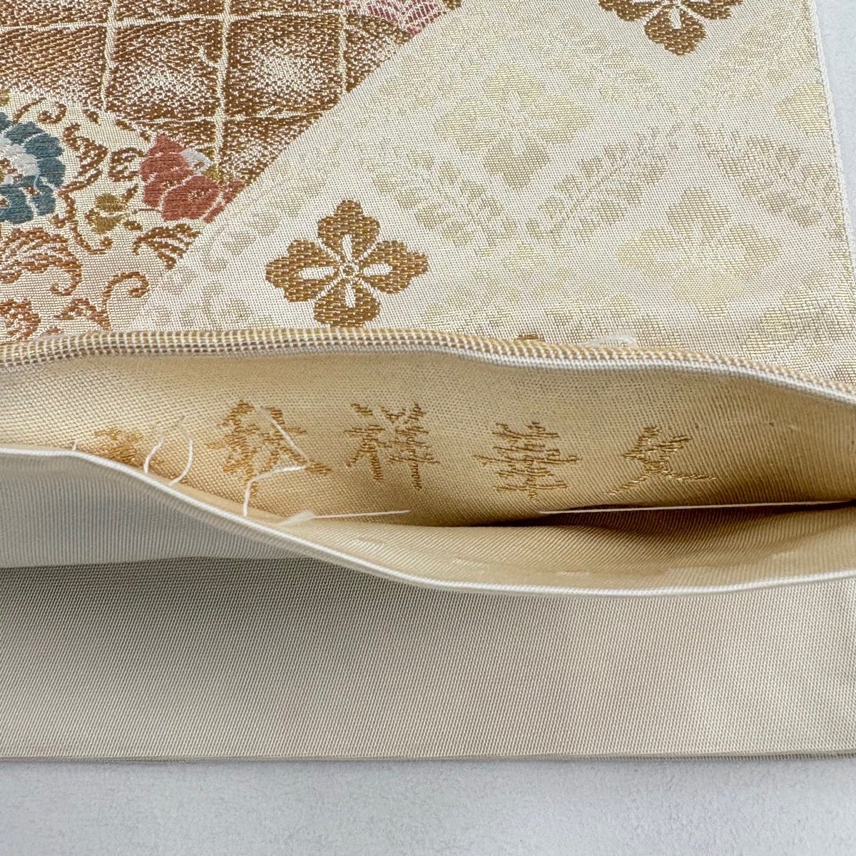 40%OFF 袋帯 逸品 山口美術織物 落款あり 亀甲地四君子丸文 刺繍 箔 クリーム お太鼓柄 正絹 K30