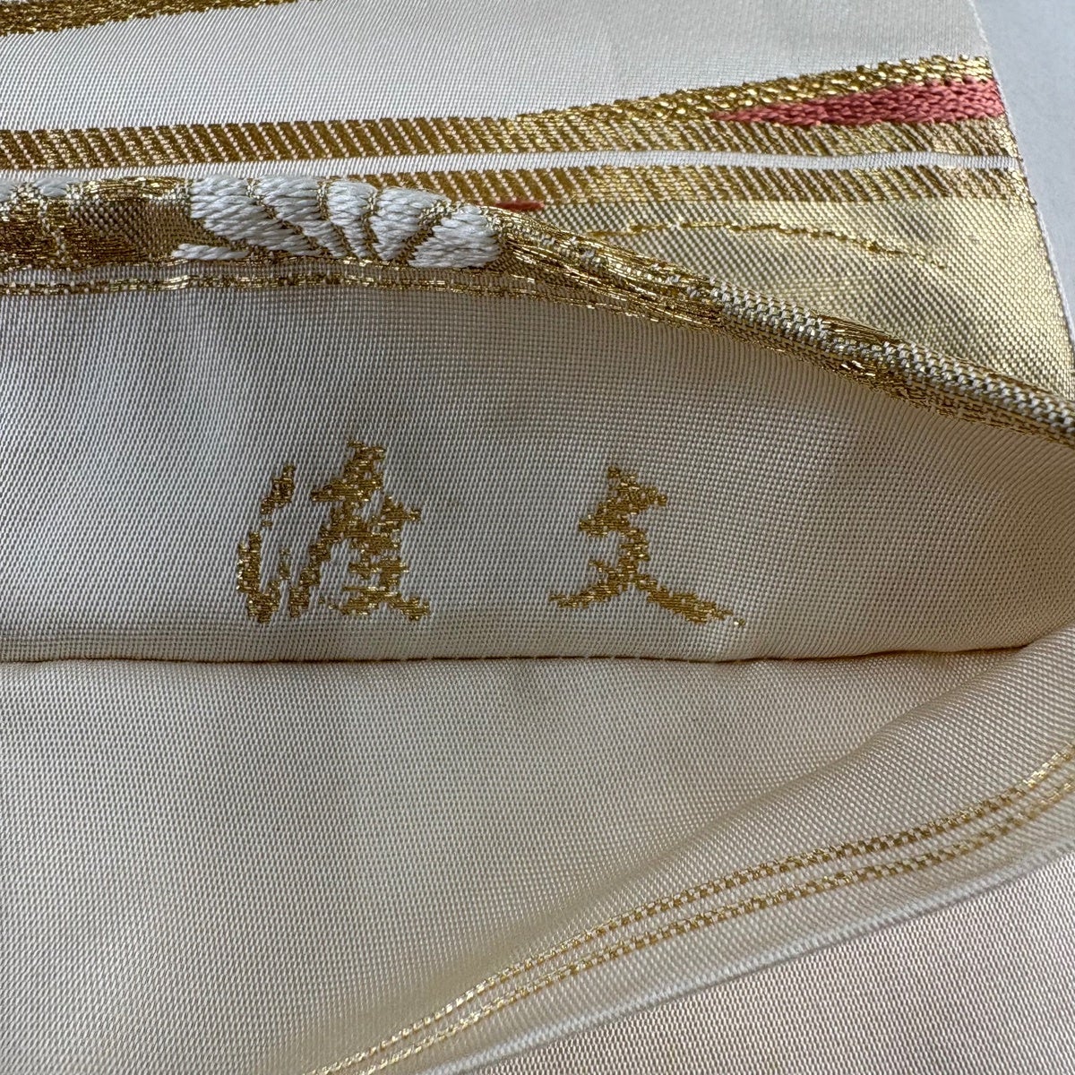 20%OFF 【美品】 袋帯 逸品 山口美術織物 落款あり 千寿吉祥文 松竹梅 鶴 唐織 金糸 クリーム 六通 正絹 K30