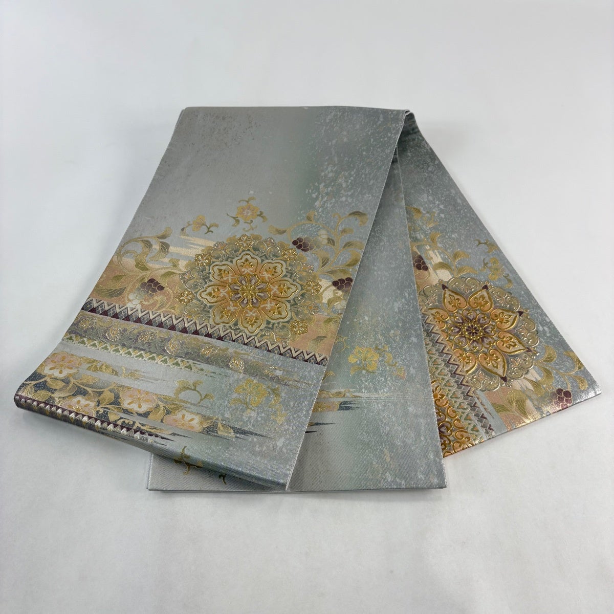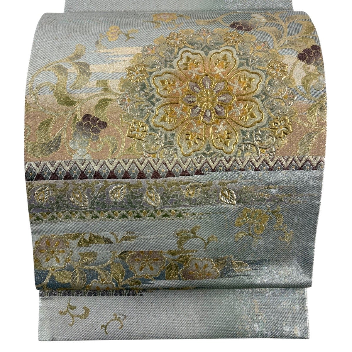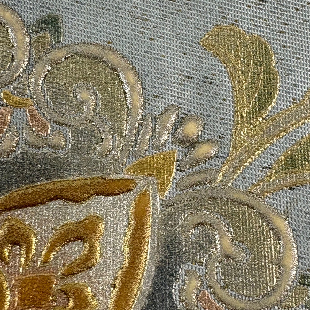 袋帯 逸品 和田光正 落款あり 高蒔絵 華文 花唐草 箔 金銀彩 灰色 お太鼓柄 正絹