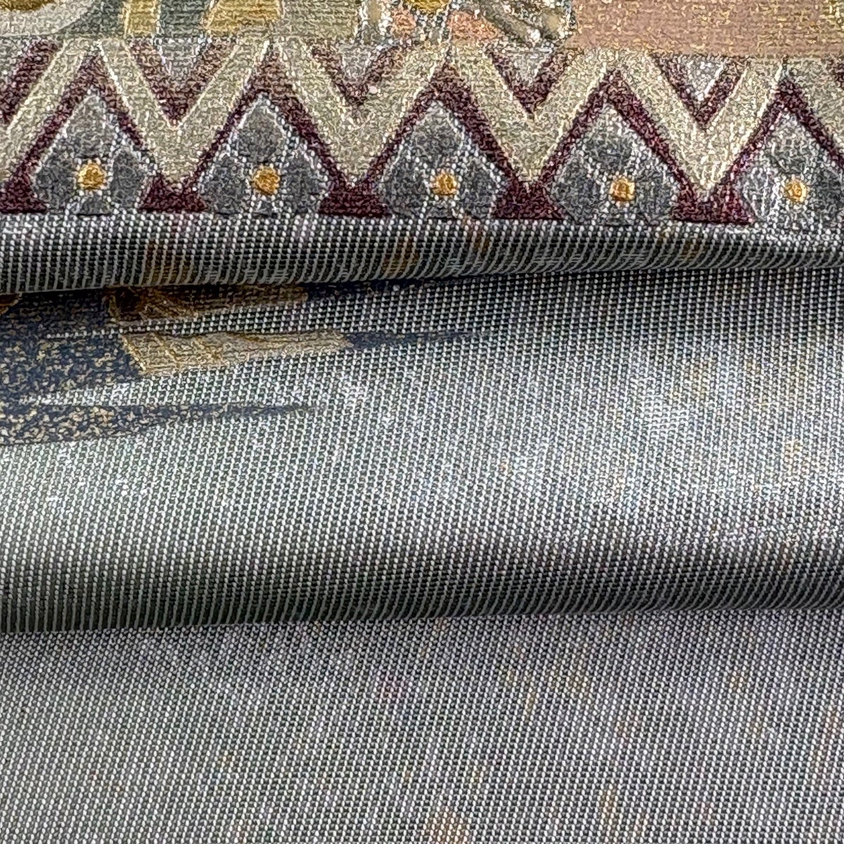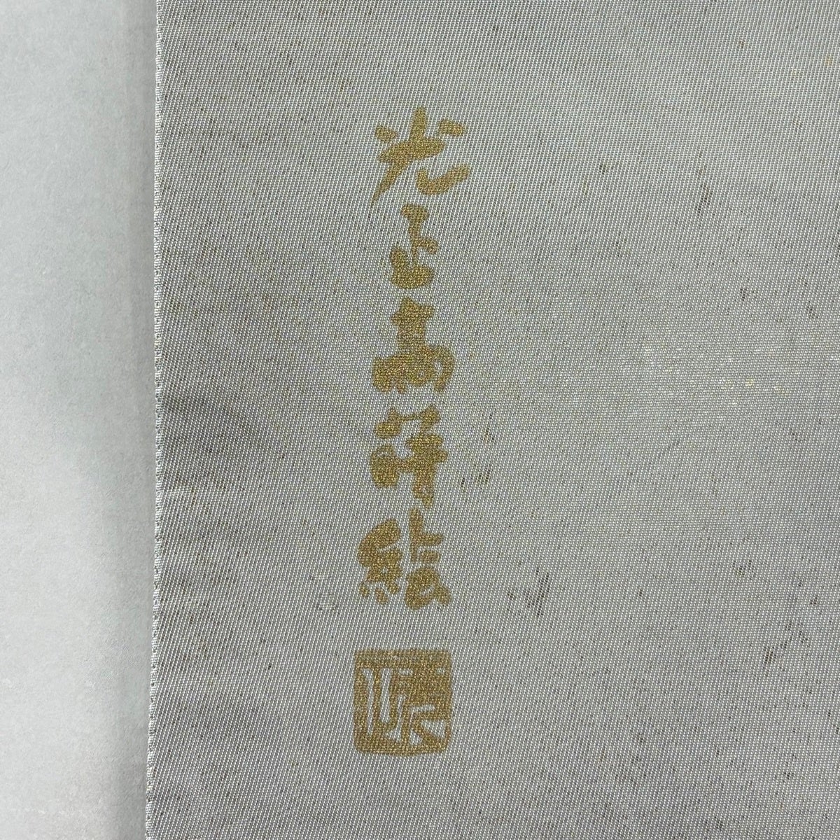 50%OFF 袋帯 逸品 じゅらく 落款あり 帝王紫 華文 松竹梅 唐織 金糸 灰色 お太鼓柄 正絹 K50