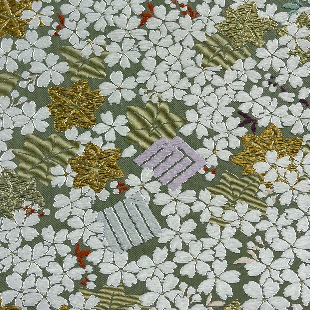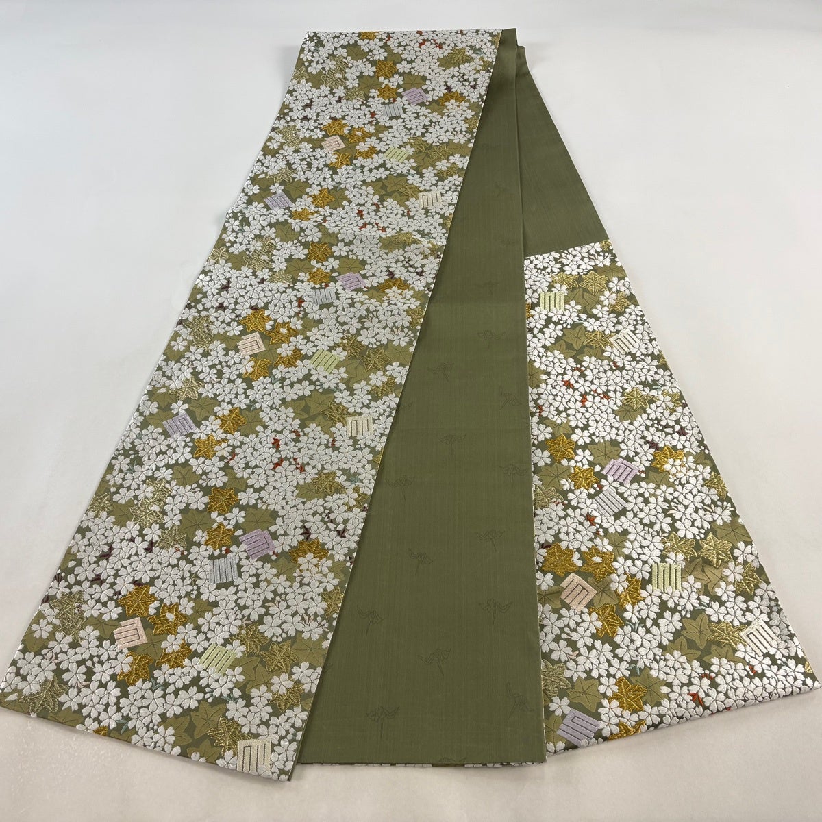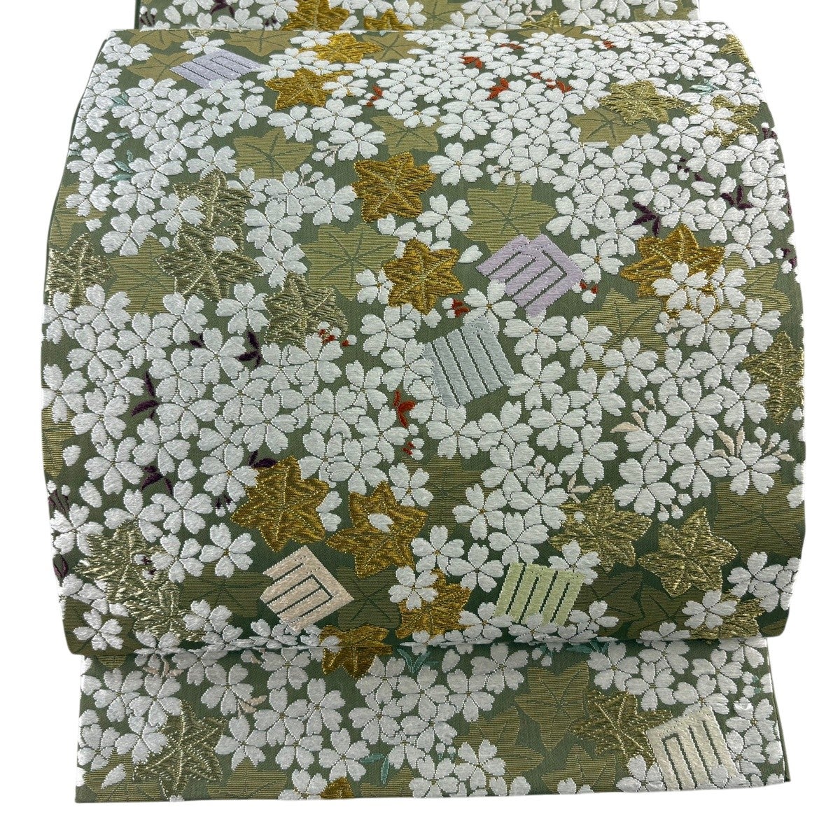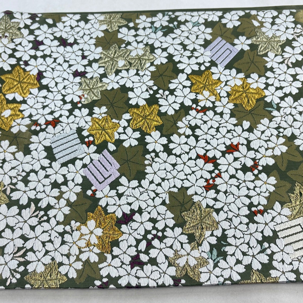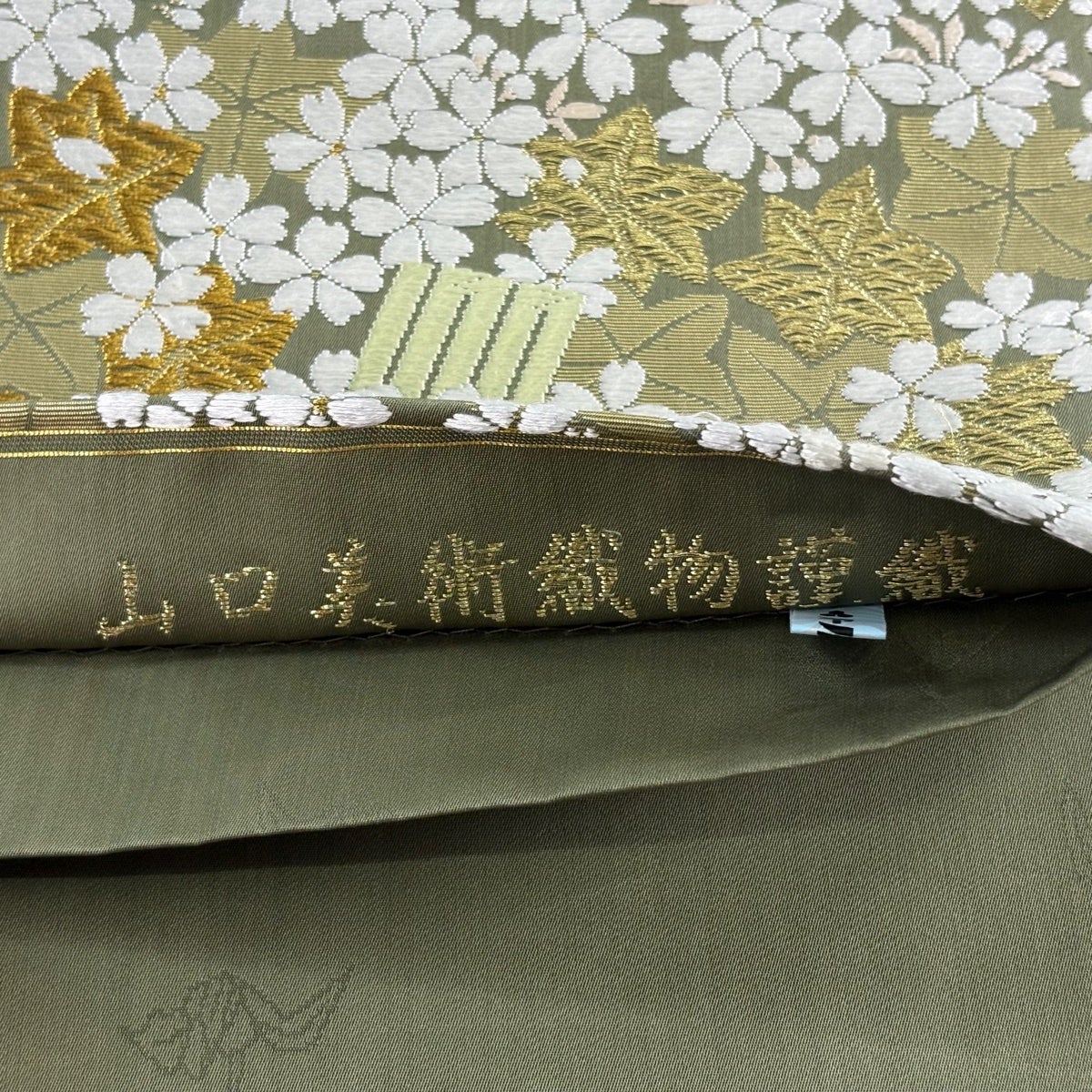 袋帯 逸品 山口美術織物 落款あり 春秋花映 桜楓 源氏香 唐織 金糸 灰緑 六通 正絹