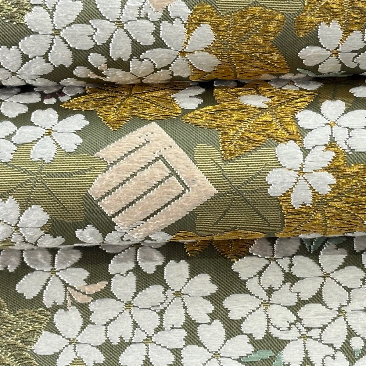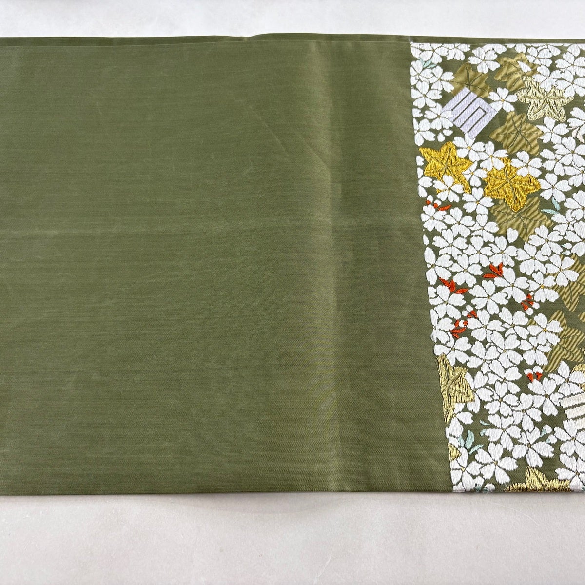 【最終価格】 70%OFF 袋帯 逸品 河合美術織物 落款あり 関西仕立て 糸巻き 桜 刺繍 金糸 金茶 六通 正絹 K70