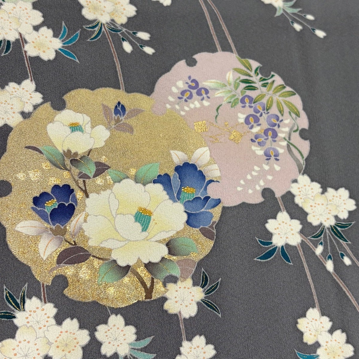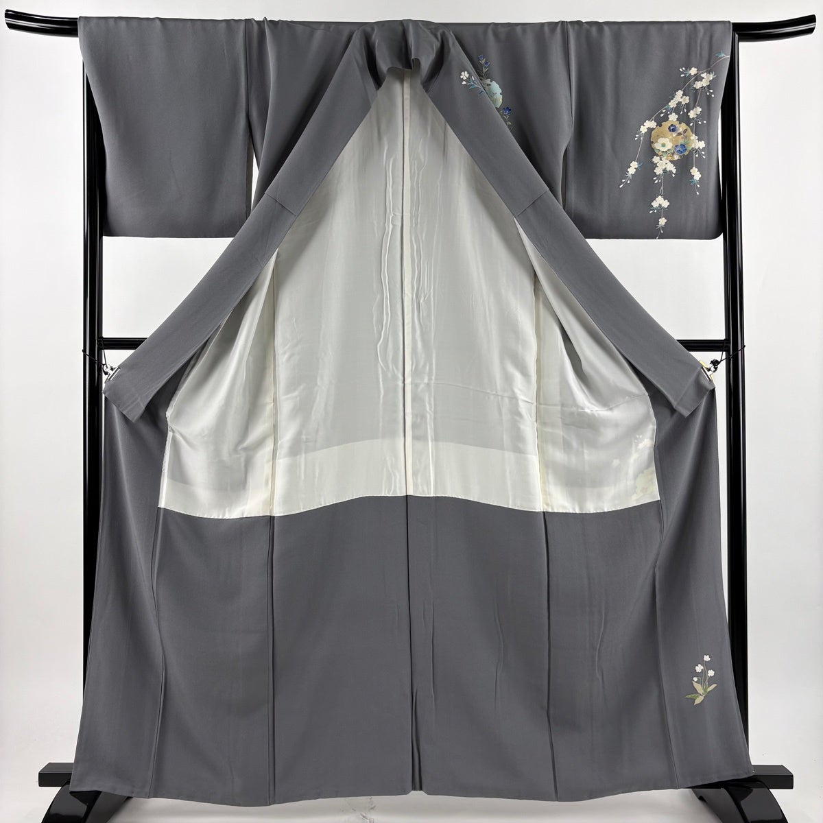訪問着 身丈161.5cm 裄丈67cm M 袷 草花 雪輪 金彩 ぼかし 灰色 正絹 秀品