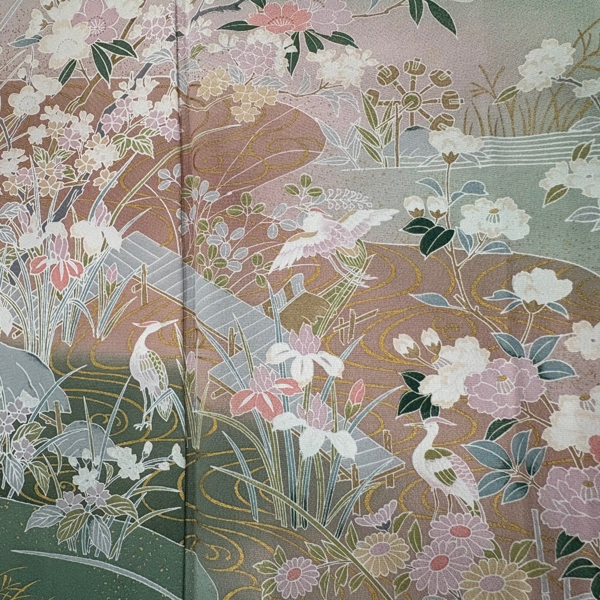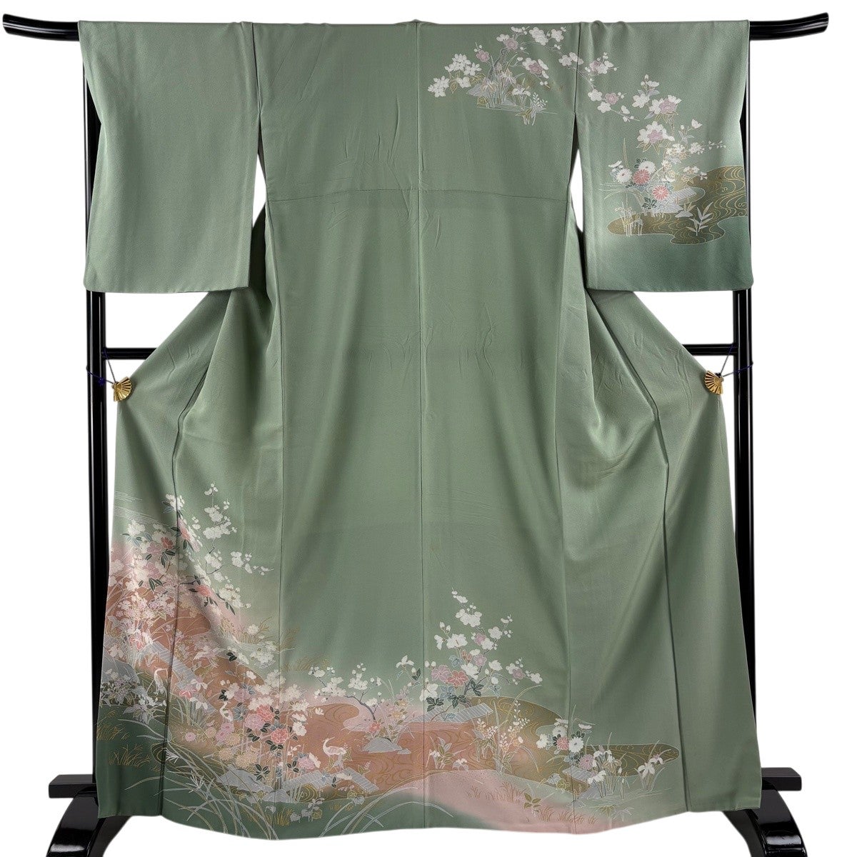 訪問着 身丈166cm 裄丈67.5cm L 袷 枝梅 花鳥 金彩 ぼかし 灰緑 正絹 秀品