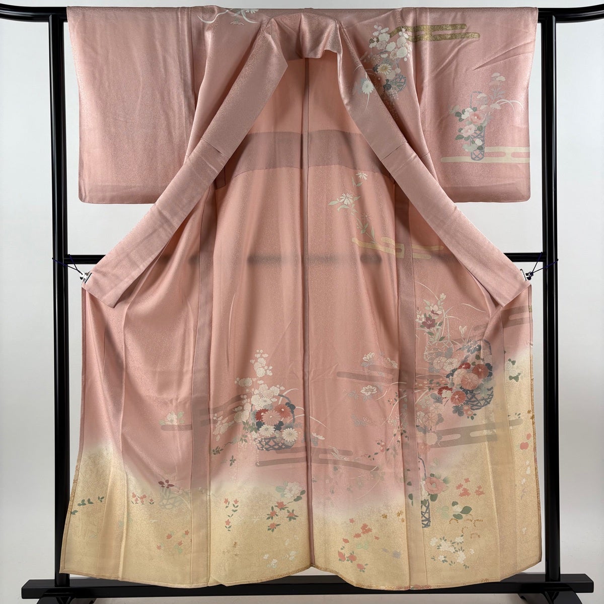 訪問着 身丈160cm 裄丈65.5cm M 袷 枝花 金糸 金彩 ピンクベージュ 正絹 名品