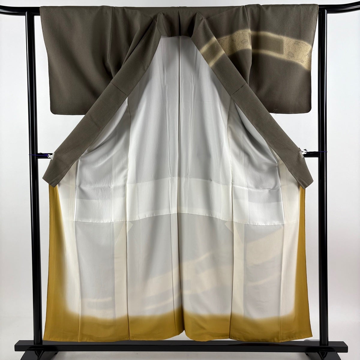 【美品】 訪問着 身丈168.5cm 裄丈66cm M 袷 松皮菱 草花 金彩 ぼかし 灰緑 正絹 秀品