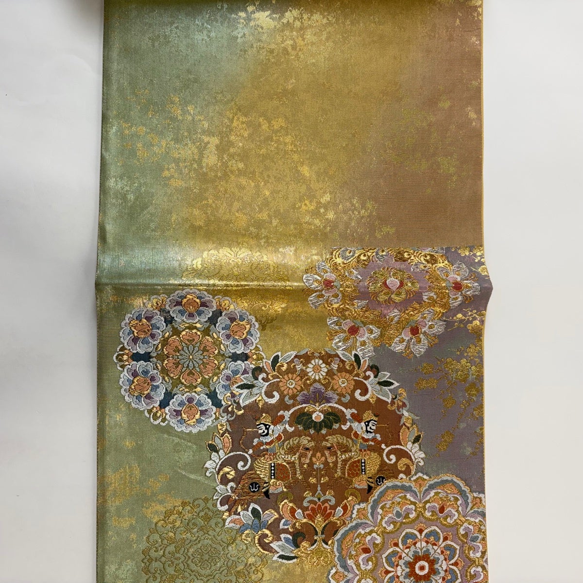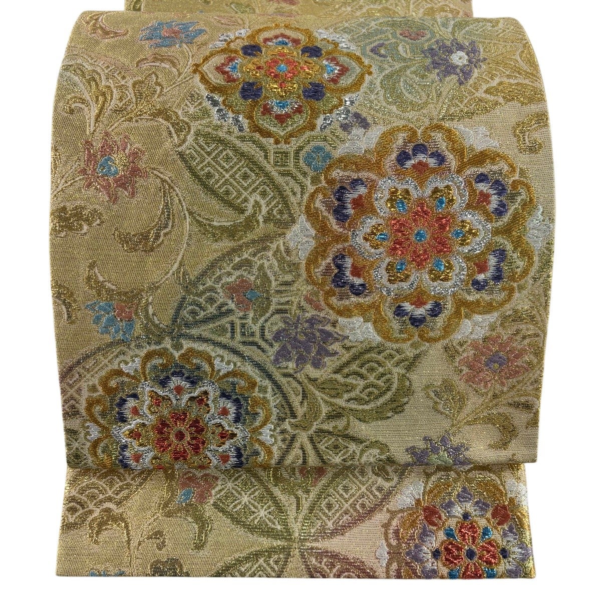 【美品】 袋帯 秀品 振袖向き 花 有職文様 箔 金糸 ベージュ 六通 正絹