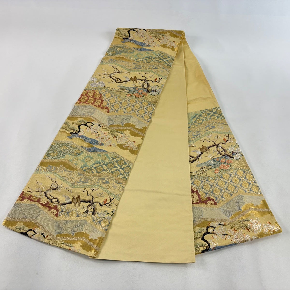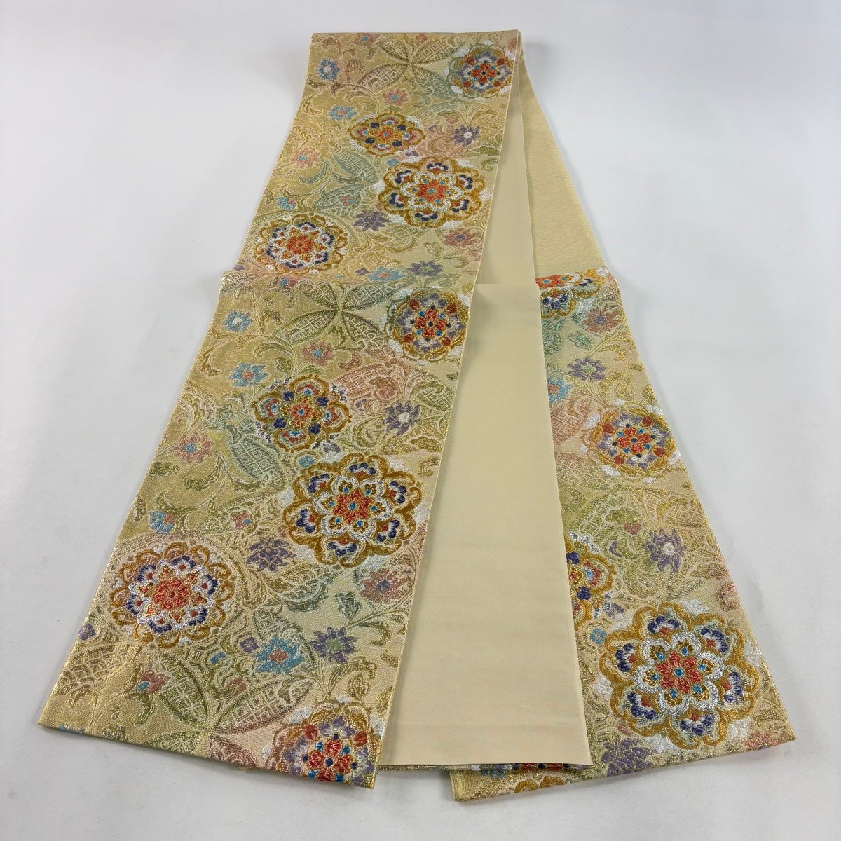 【美品】 袋帯 秀品 草花 唐織 金銀糸 薄黄 六通 正絹